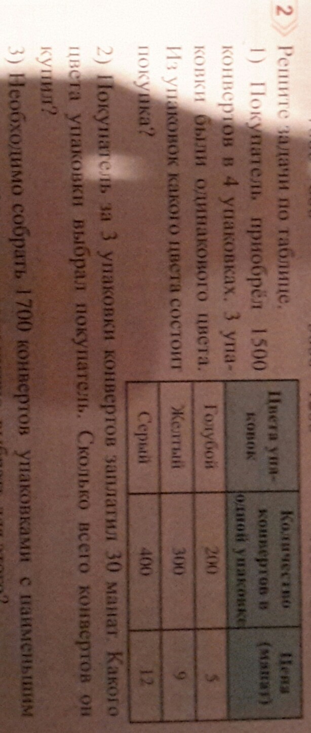 2)серый и жёлтый, так как:12+9+9=30 . всего он купил 1000 конвертов, так как:400+300+300=1000