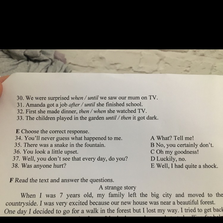 30. Мы были удивлены, когда / пока мы не увидели нашу маму на телевидении. Аманда устроилась на работу после окончания школы. 32. Сначала она обедала, потом смотрела телевизор 33. Дети играли в саду до тех пор, пока не стемнело. E Выберите правильный ответ. Что? Расскажи мне! 34. Вы никогда не догадаетесь, что со мной произошло. 35. В фонтане была змея. B Нет, вы, конечно, дора 36. Вы выглядите немного расстроенным. C О, боже мой! 37. Ну, ты не видишь, что каждый день, не так ли? D К счастью, нет. E Ну, у меня было довольно 38. Был ли кто-нибудь больно? F Прочитайте текст и ответьте на вопросы. Странная история Когда мне было 7 лет, моя семья покинула большой город и переехала в деревню. Я был очень взволнован, потому что наш новый дом был рядом с прекрасным видом. Однажды я решил пойти на прогулку в лес, но я потерял свой путь. Я попытался