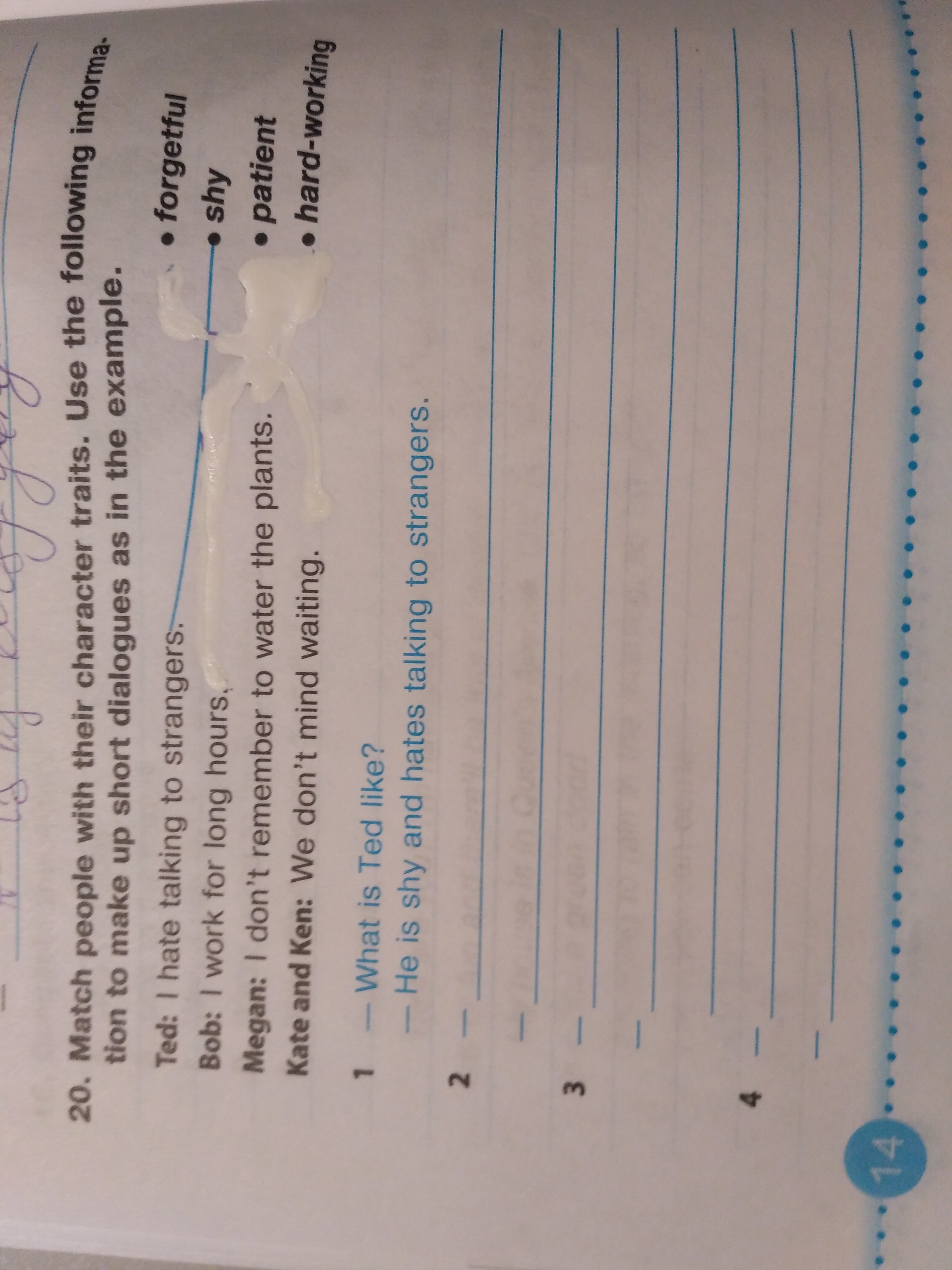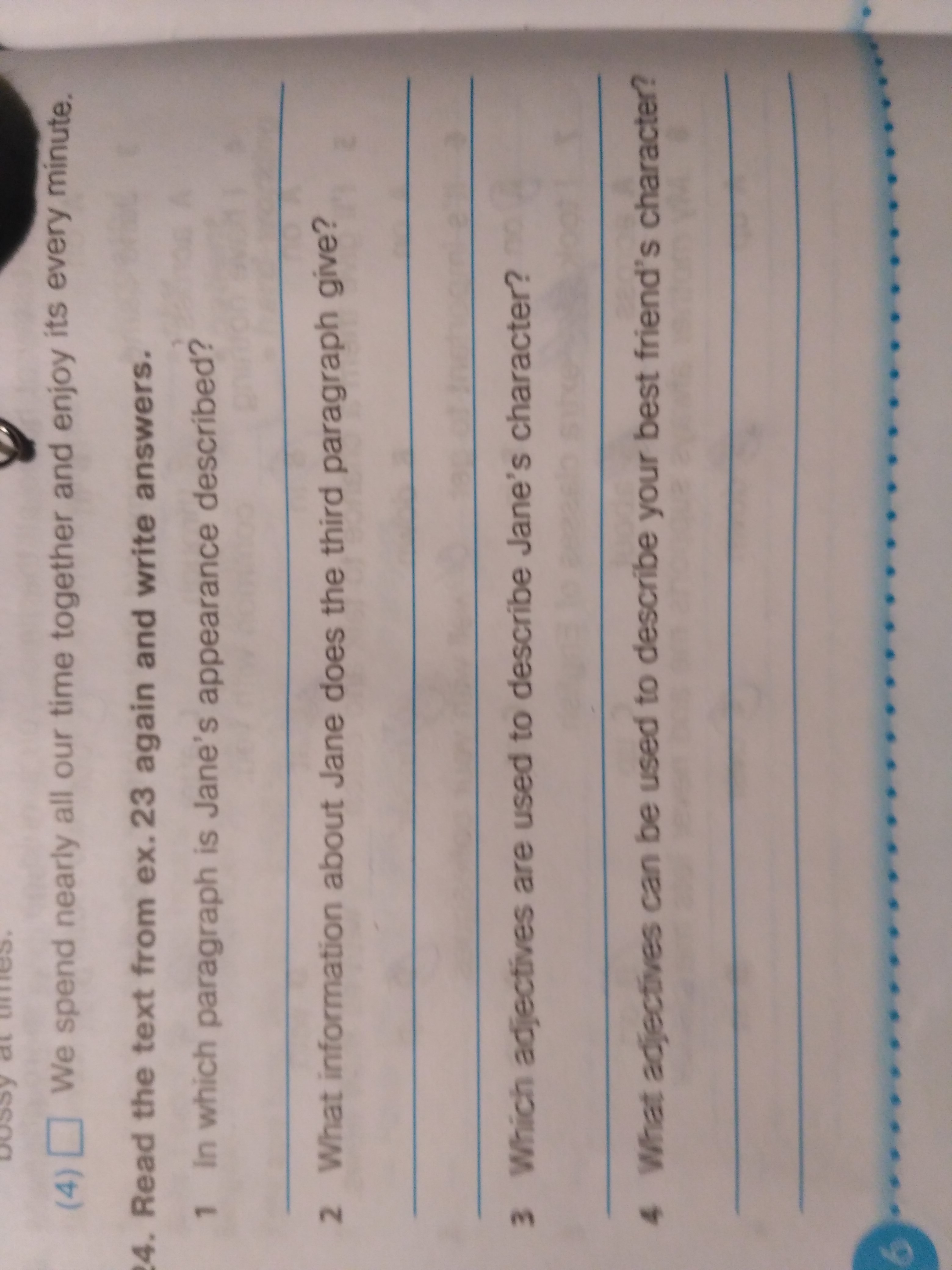 Должен предупредить что я не такой уж эксперт в английском но я сделал всё что мог и вот что получилось: упр.23; (1) B, (2) D, (3) C, (4) A. упр.24; 1. in third paragraph. 2. She was kind and fun. She has got a sense of humor. 3. Kind, fun, bossy, generous, great. 4. тут нужно тоже самое что и в 3. но про своих друзей ( то есть описать их прилагательными на английском ). упр. 20 *после образца. What is Bob like ? - He is hard-working and works for long hours. What is Megan like ? - She is forgetful and doesn't remember to water the plants. What are Kate and Ken like ? - They patient and don't mind waiting. Самое главное - это старание и стремление к цели :)