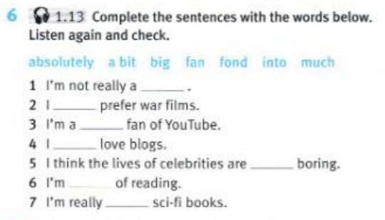 1. fan 2. much 3. big 4. absolutely 5. a bit 6. fond 7. into