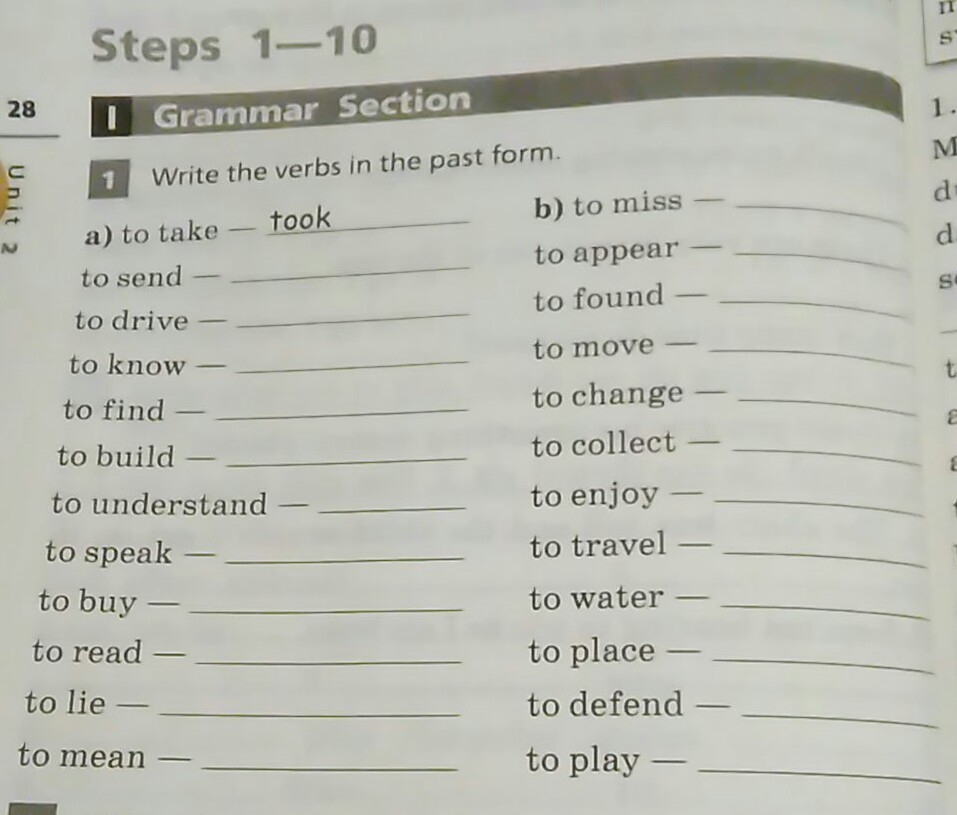 1)send-sent,drive-drove,know-knew,find-found,build-built,understand-understood,speak-spoke,buy-bought,read-read,lie-lied,mean-ment,