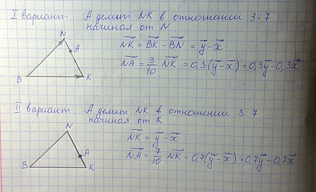 в треугольнмке ВNK ,на сторонеNK отложена точка A и делит ее в отношении 3:7 разложите вектор NA если BN=x(вектор),BK=y(вектор)