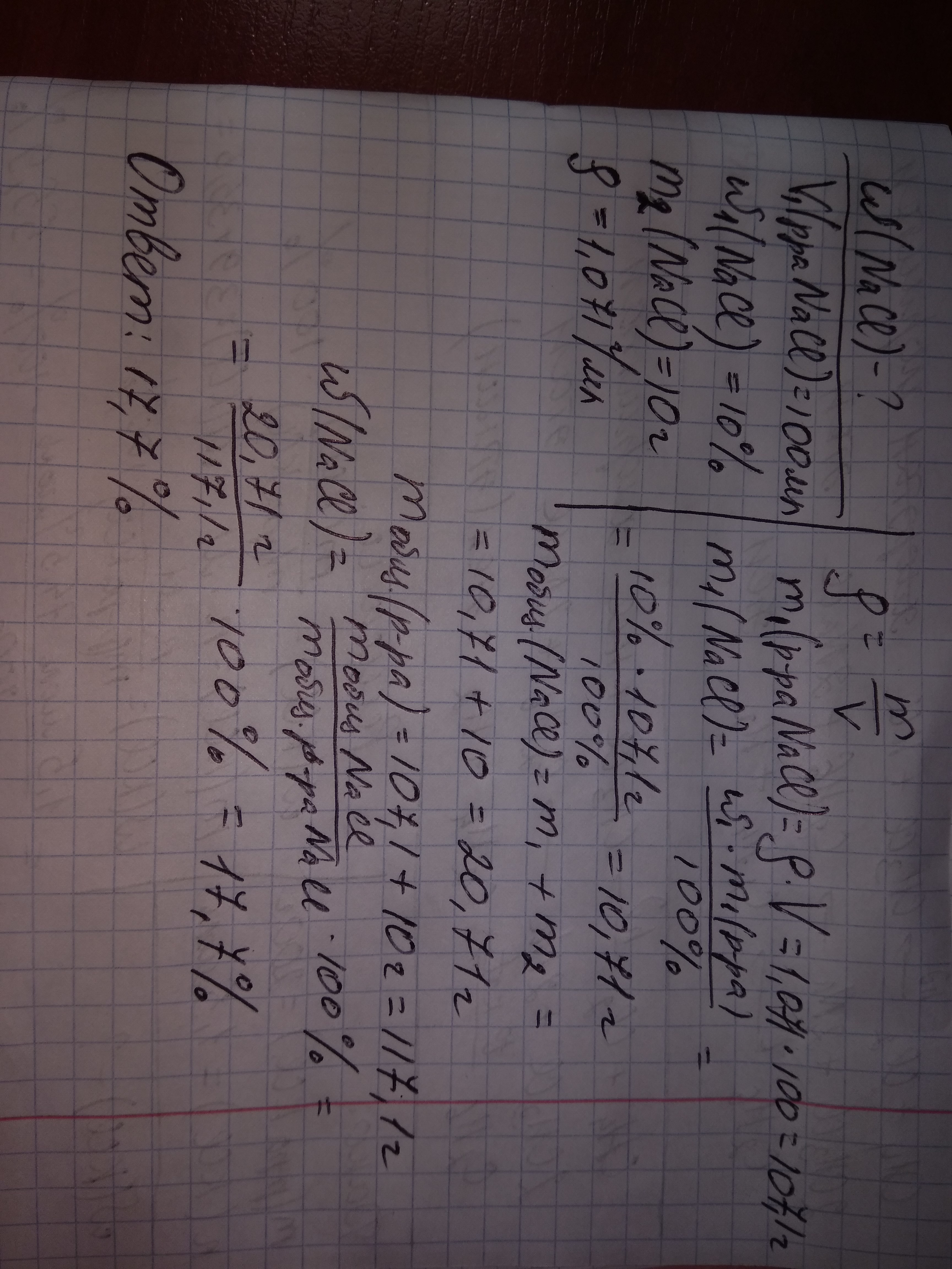 Рассчитайте массовую долю соли в растворе, если в 100 мл 10% хлорида натрия (ро=1,071г/мл) растворили 10г хлорида натрия