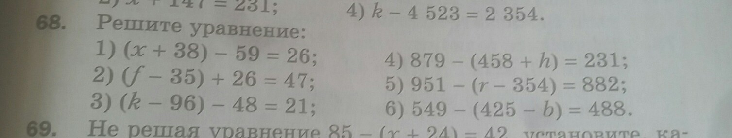 1) х=26+59-38=47. 2) f=47-26+35=56. 3) k=21+48+96=165. 4) 421-h=231,h=190. 5) 1305-r=882,r=423. 5) 124+b=488,b=364. В примерах 4,5,6 раскрыла скобки.