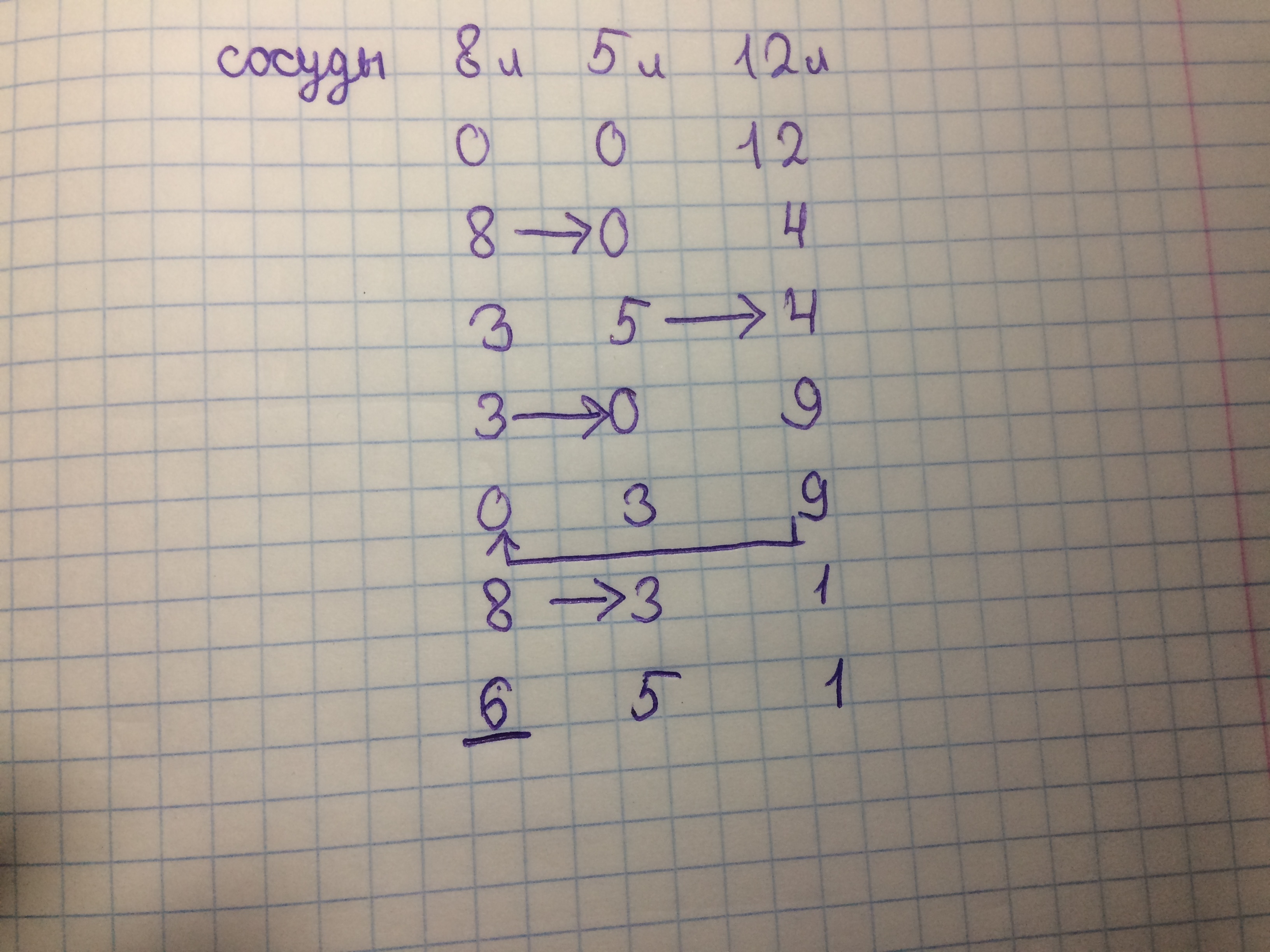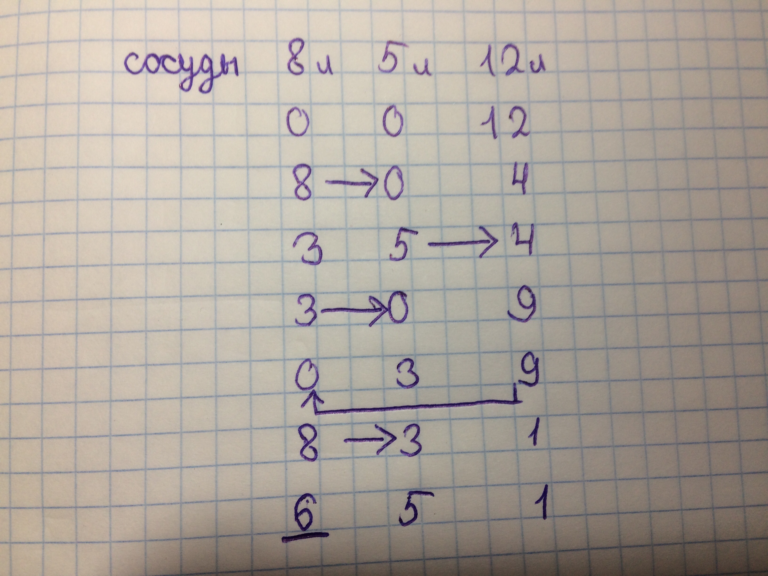 Некто имеет 12 пинт вина и хочет отлить из этого количества половину, но у него нет сосуда в 6 пинт. Зато есть два других сосуда в 8 пинт и 5 пинт. Нарисуте на бумажке схему и пришлите.