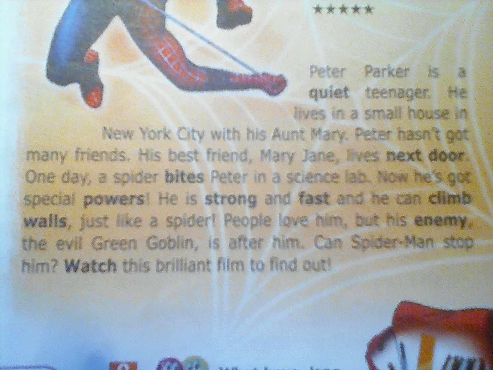 Питер Паркер - тихий подросток. Он живет в маленьком домике в Нью-Йорке со своей тетей Мэри. У Питера мало друзей. Его лучший друг, Мэри Джейн, Евы по соседству. Однажды паук укусил Петра в научную лабораторию. Теперь у него особые силы. Он сильный и быстрый, и он может подняться на стены, как паук! Люди любят его, но его враг, злой Зеленый Гоблин, стоит за ним. Может ли Человек-Паук остановить его? Смотрите этот блестящий фильм, чтобы узнать!
