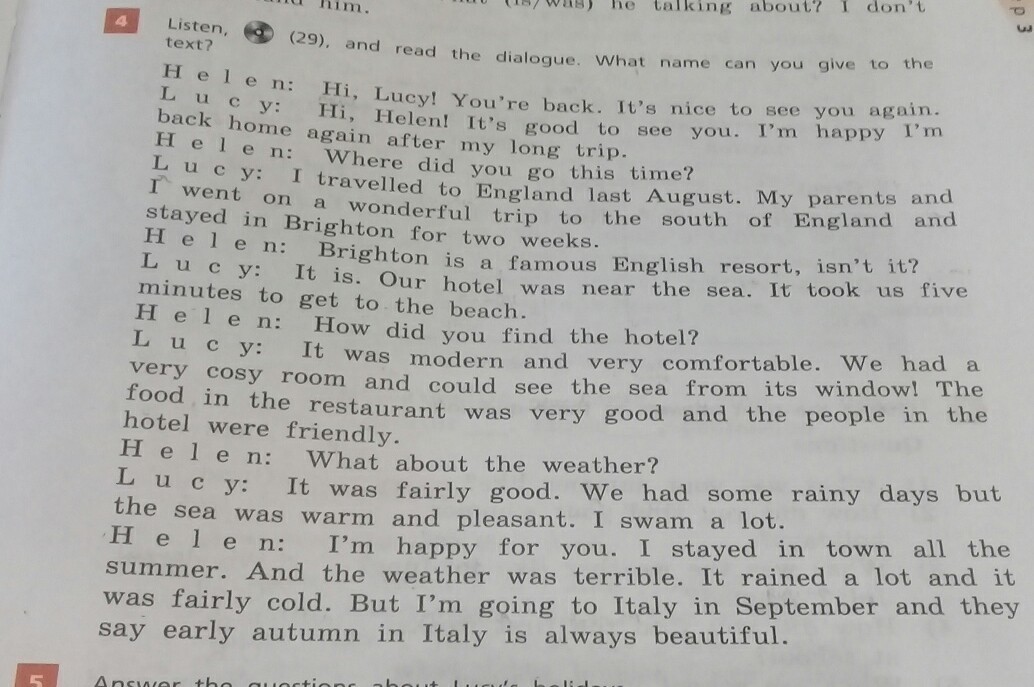вернуться домой снова после моего долгого 1 n u Куда вы отправились на этот раз? и y: I Англия в августе прошлого года. Мои родители остались в прекрасной поездке на юг Англии и в Брайтоне две недели. Брайтон - это английский курорт, не так ли? L u c y: Это так. Наш отель был недалеко от моря. взял нас пять минут, чтобы добраться до пляжа. H e l e n: Как вы нашли отель? u c был современным и очень удобным. У нас был очень уютный номер и посмотреть море из окна. Еда в ресторане была очень хорошей, а люди в отеле были дружелюбны. Что такое погода? дней, но у: Это было довольно хорошо. У нас было какое-то дождливое море, было тепло и приятно. Я много плавал. город, в котором все остались довольны много и летом. И погода была ужасная. Это было довольно холодно. Но я еду в Италию в сентябре и хот