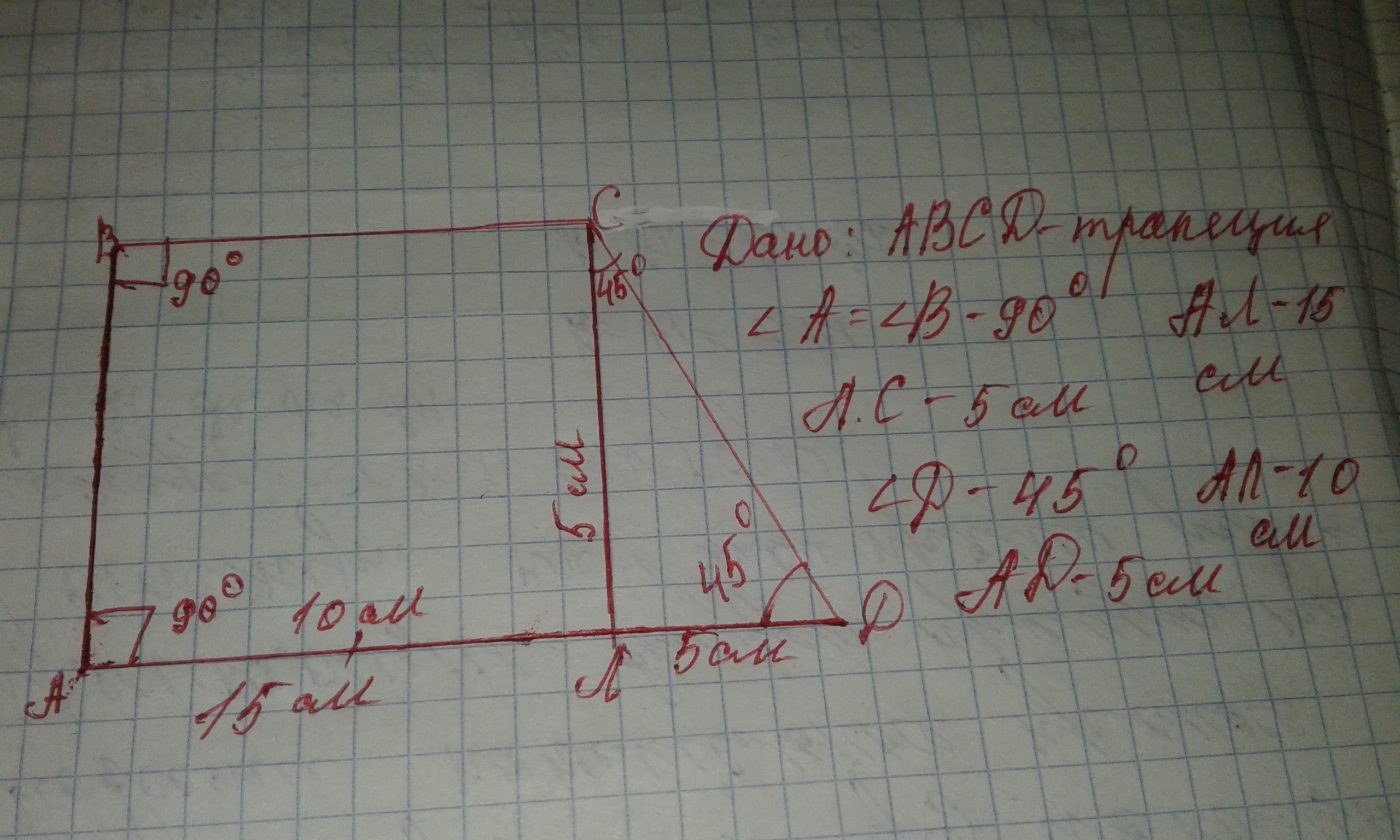 Если угол СЛД=90,значит СЛ-является высотой трапеции АВСД -из этого следует, что ВС=АЛ=10(см) и ВА=СЛ=5(см) (прямоугольник)
