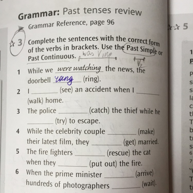2.saw,walked 3.cathed, tryed 4. made, got 5.rescued, put out 6. arrived, waited