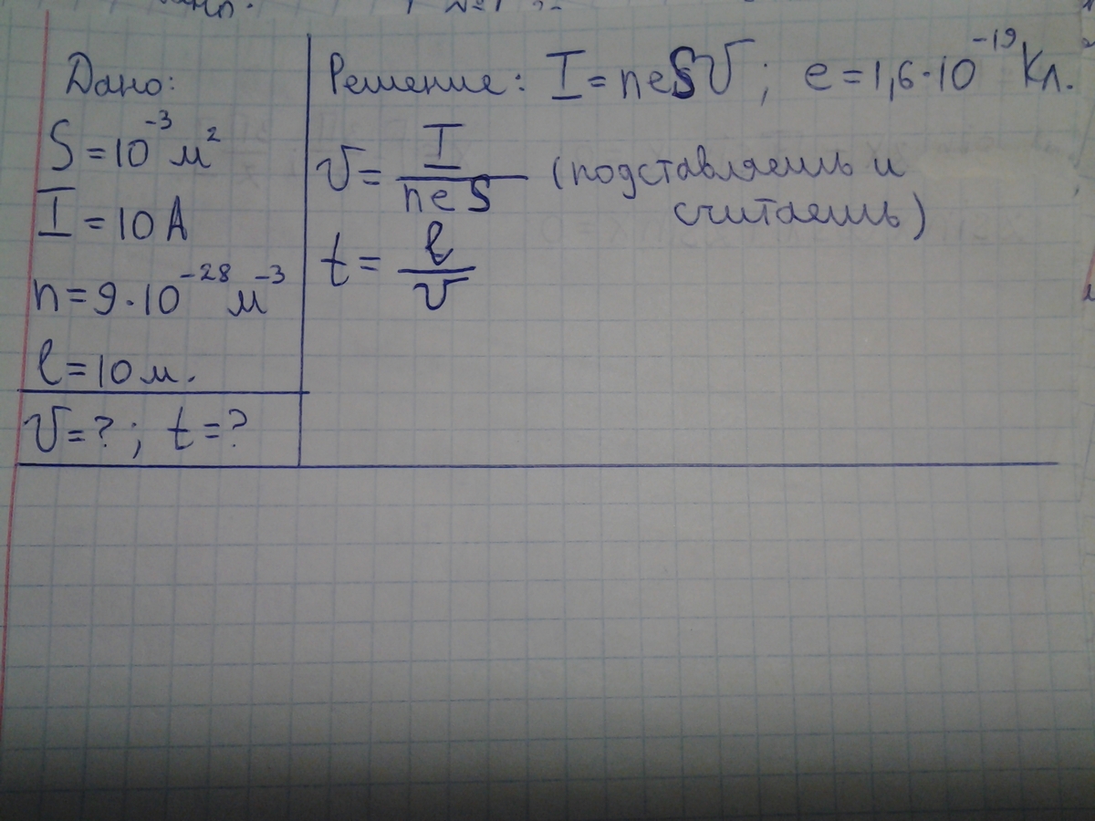 ПОМОГИТЕ ПОЖАЛУЙСТА СРОЧНО!!!БУДУ БЛАГОДАРНА!!!Вычислите среднюю скорость упорядоченного движения электронов в медном проводнике, площадь поперечного сечения которого 10^-3 м^2. Сила тока в проводнике 10 А, концентрация электронов 9*10^28 м^-3. Какое время понадобится электронам, чтобы пролететь от одного конца проводника до другого, если его длина составляет 10 м?