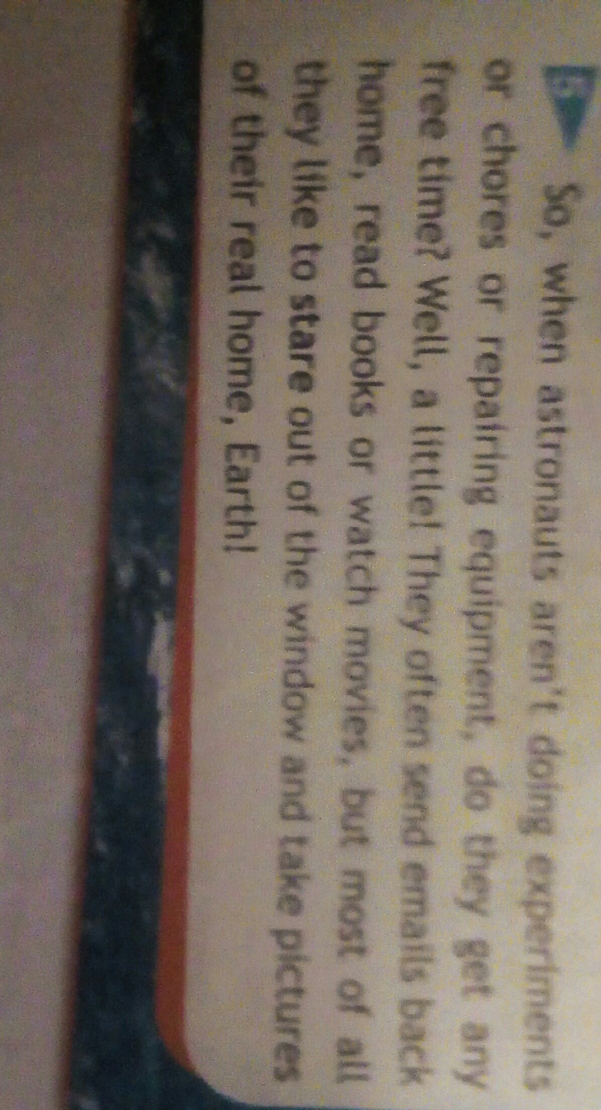 Итак, когда космонавты не экспериментируют, выполняют обязанности или не ремонтируют оборудование, есть ли у них свободное время? Да, немного! Они часто отправляют сообщения домой, читают книги или смотрят фильмы, но больше всего они любят смотреть в окно и фотографировать их настоящий дом, Землю!