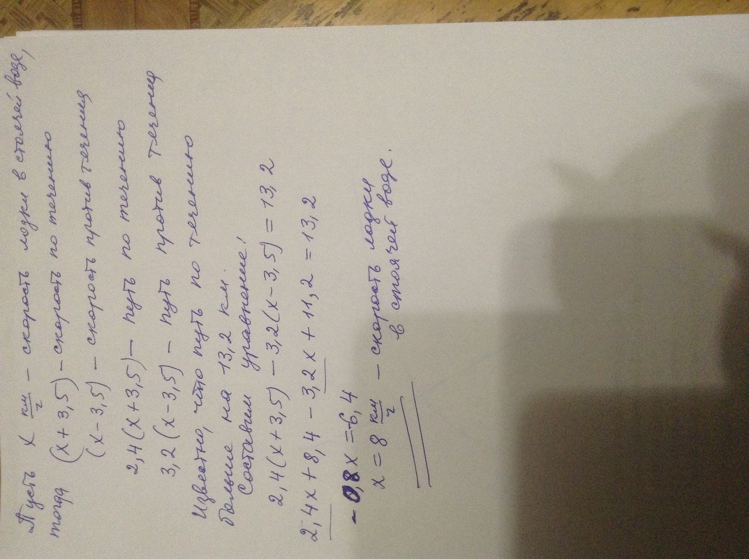 Лодка шла по течению реки 2,4 ч и против течения 3,2 ч. Путь пройденный лодкой по течению оказался на 13,2 км длиннее пути пройденного против течения. Найдите скорость лодки в стоячей воде если скорость течения реки равна 3,5 км/ч. РЕШИТЕ ПЛИЗ! ОЧЕНЬ СРОЧНО!