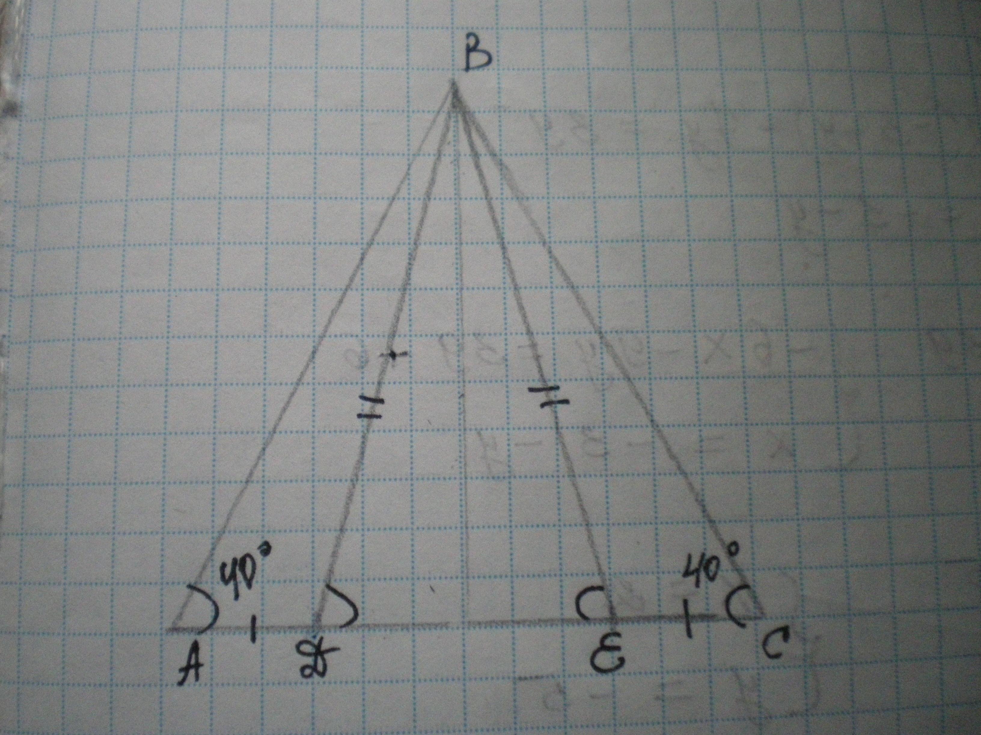 Из равенства треугольников следует, что их соответственные углы равны, т.е. ∠BAD=∠ВСЕ=40°.