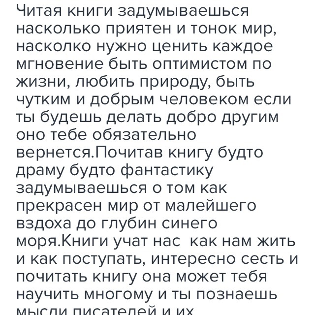 Читая книги любого автора, я не только учусь думать и анализировать. но и брать пример с героев, делать так же. Каждая история, по-своему представляет нам развитие событий и поведение лиц, задействованных в той или иной сцене! Буквально недавно, я(например) читала книгу Портрет Дориана Грея, которую решаются прочитать не многие взрослые. Тему мыслей Уальда и его усидчивость над работой не прошли зря. Я подчерпнула много нового, важного и полезного. Например то. что крсота-это вещь, которой способны покоряться, не внимая на труд и талан, что сила кровной мести сильнее . чем сама родственная любовь, что люди. порой не замечая простого:обмана, лжи, заносчивости. способны на причинение вреда своим близким и знакомым. Не только эта книга учит меня каким то жизненнонеобходимым фактам, все книги внушают что-то свое неповторимое!