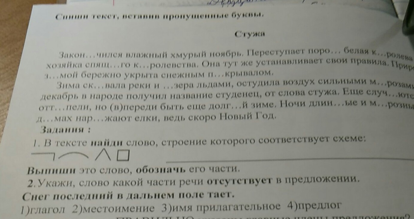 а 2? Укажи слово какой части речи отсутсвует в предложении. Снег последний в дальнем поле тает.