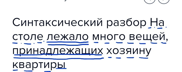 На столе-дополнение (- - -), лежало-сказуемое, много-обстоятельство, вещей- дополнение, принадлежащих-притч., хозяину-дополнение, квартиры-дополнение.