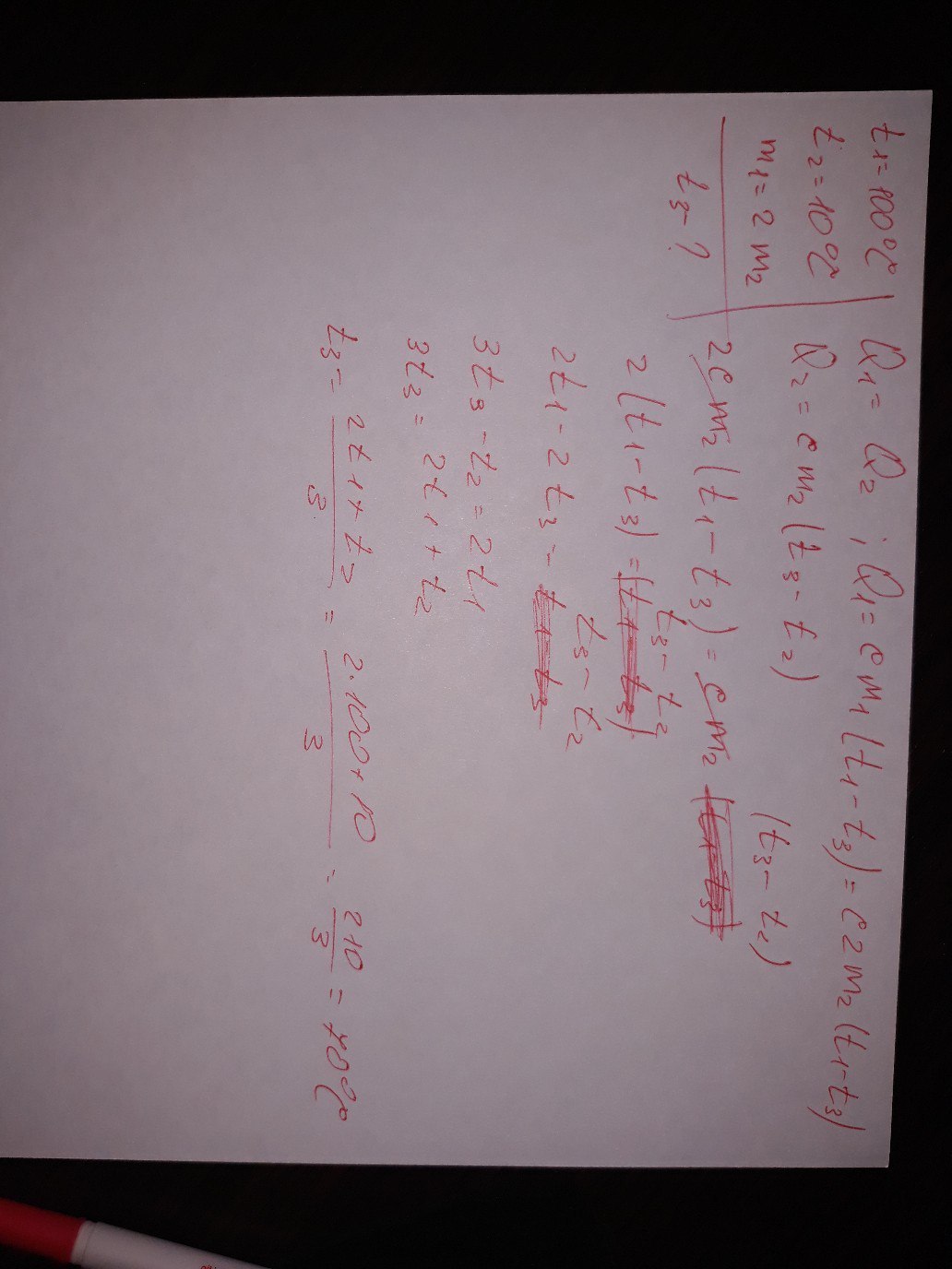 Смешали горячую и холодную воду температура гоячей воды =100°С , температура холодной воды=10°С . Найти температуру смеси, если масса горячей воды в 2раза превышает массу холодной воды.