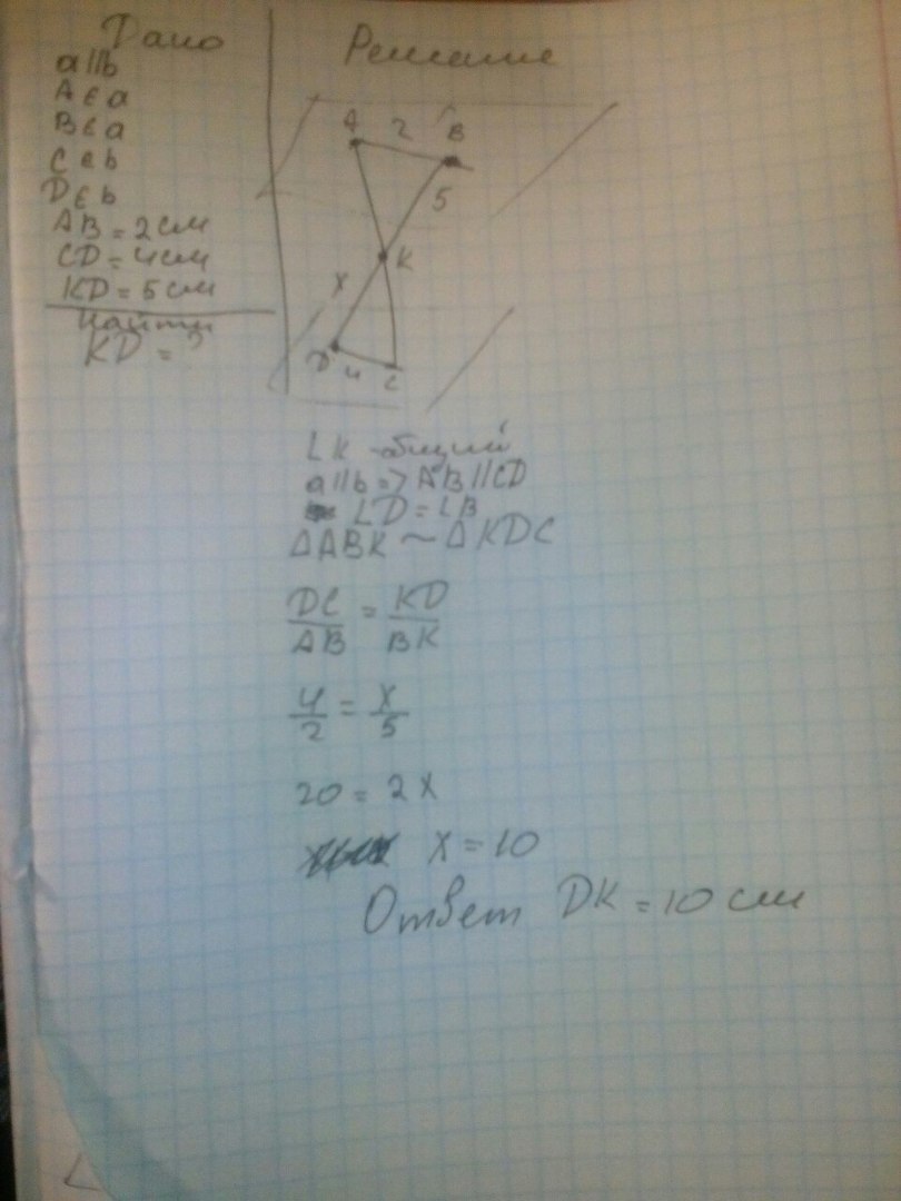 Дано параллельные плоскости α и β. Точки А и В лежат на плоскости α, а точки С и D – на плоскости β. Отрезки АС и ВD пересекаются в точке К. Найдите длину отрезка КD, если АВ = 2 см, CD = 4 см, КВ = 5 см.