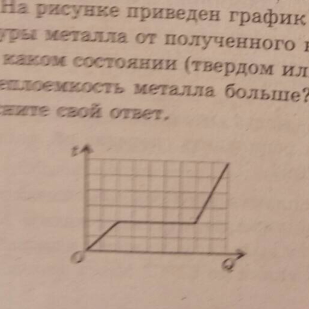 металлическую деталь помещают в плавильную печь. На рисунке приведён график зависимости температуры металла от полученного количества теплоты. В каком состоянии ( твердом или жидком) удельная теплоёмкость металла больше? во сколько раз? Объясните ответ.