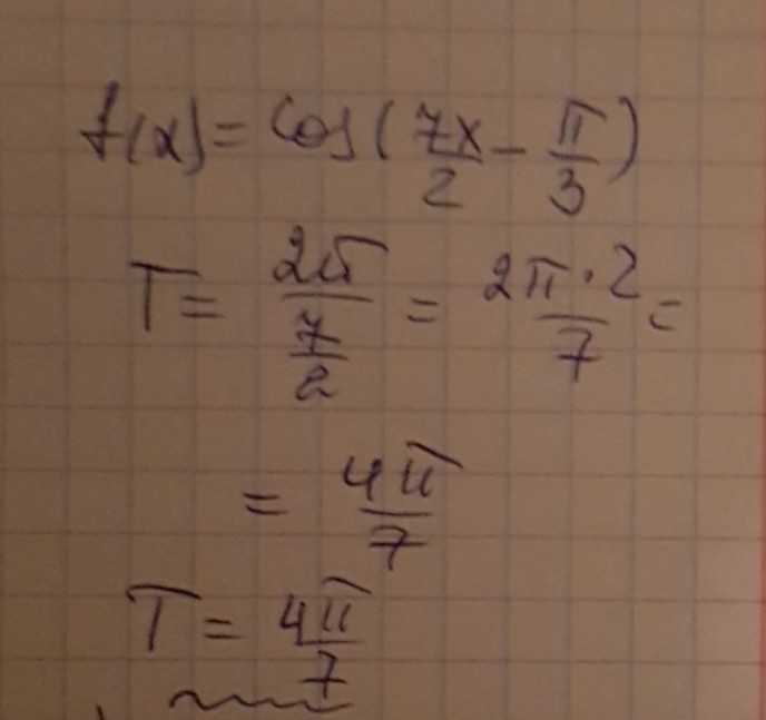 Найти наименьший положительный период функции f(x)=cos(7x/2-пи/3)