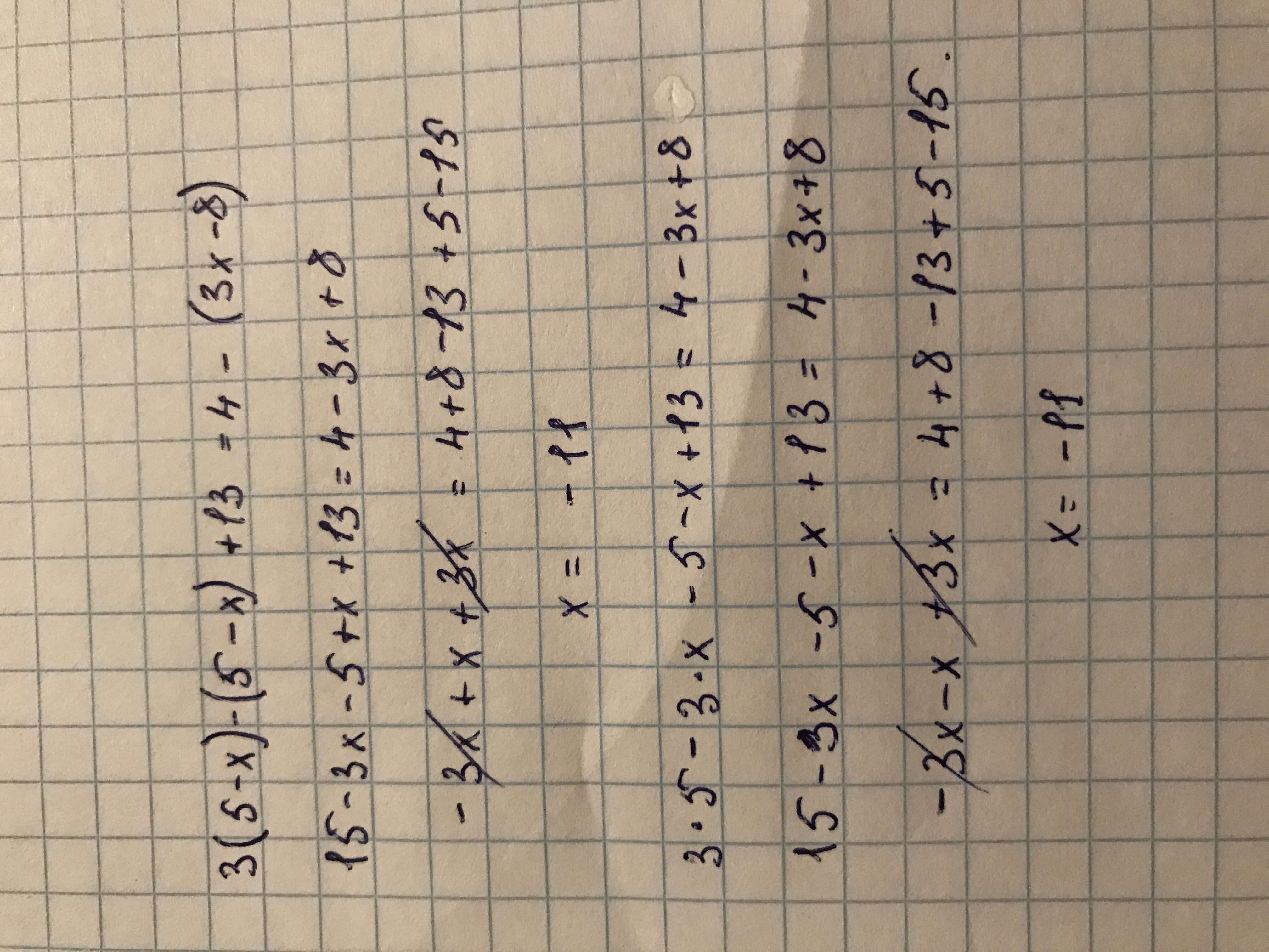 3(5-x)-(5-x)+13=4-(3x-8). 3•5_3•x-5-x+13=4-3x+8= иксы на лево,а цыфры на право. Вот и все а далее считают.