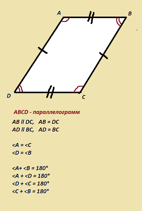 2) углы прилегающие к любой стороне параллелограмма в сумме дают 180° (если это не прямоугольник, то два прилегающих угла не равные) в общем можно запомнить, верно для всех случаев: если взяты два разных угла параллелограмма, то их сумма равна 180°