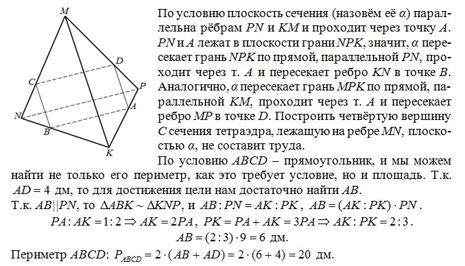 При проведении через точку А, взятую на ребре PK тетраэдра MNPK,параллельной плоскости к ребрам PN и KM, в данном сечение образовался прямоугольник ABCD. Найти периметр ABCD, если AB параллельна PN, PA:AK=1:2, PN=9 дм, AD=4 дм