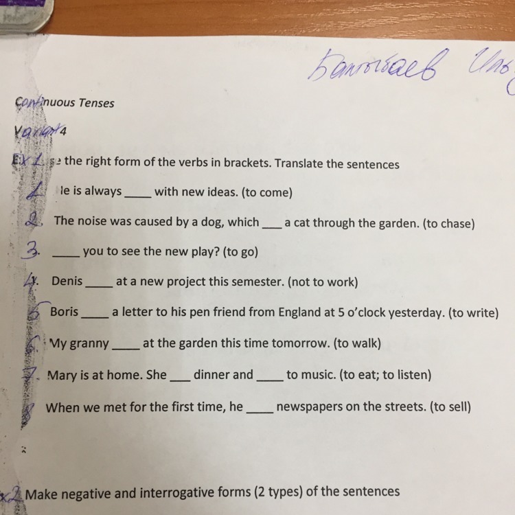 1- came, 2-chased,3-gone,4 don't works,5-written, 6-walked,7-eatten,listened,8-selt