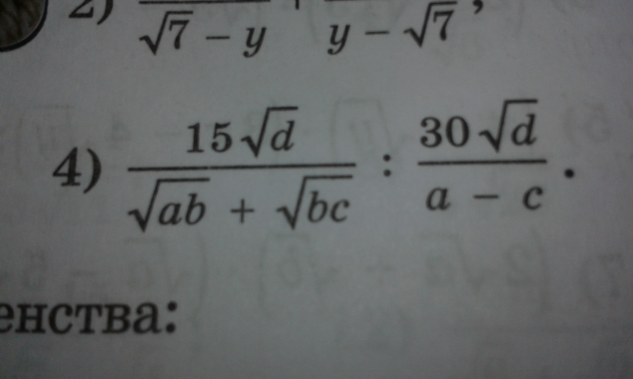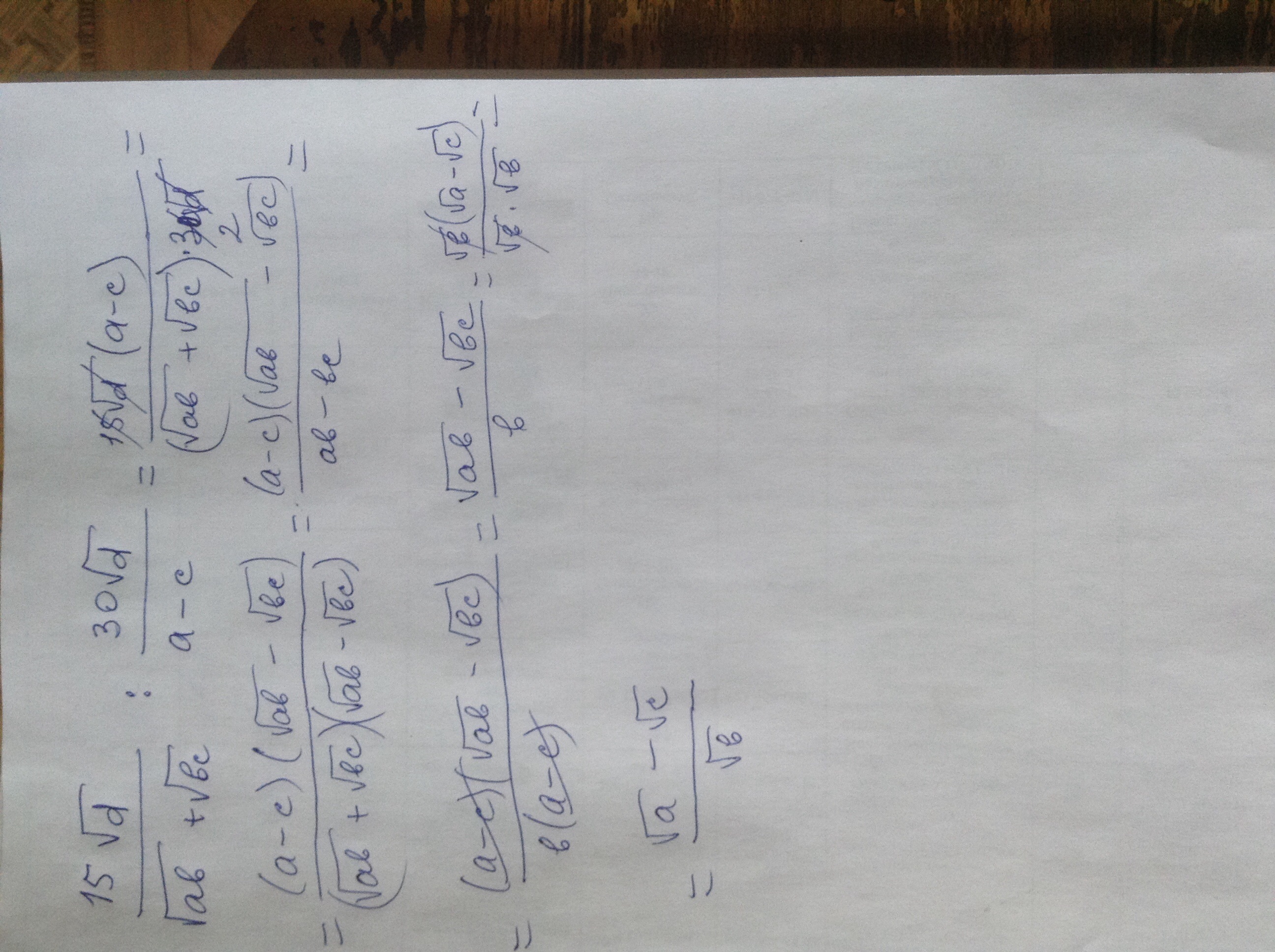 15 корень d/корень b(корень а + корень с) : 30 корень d/ (корень а - корень с)*(корень а+корень с)= (корень а - корень с)/2 кореyь b