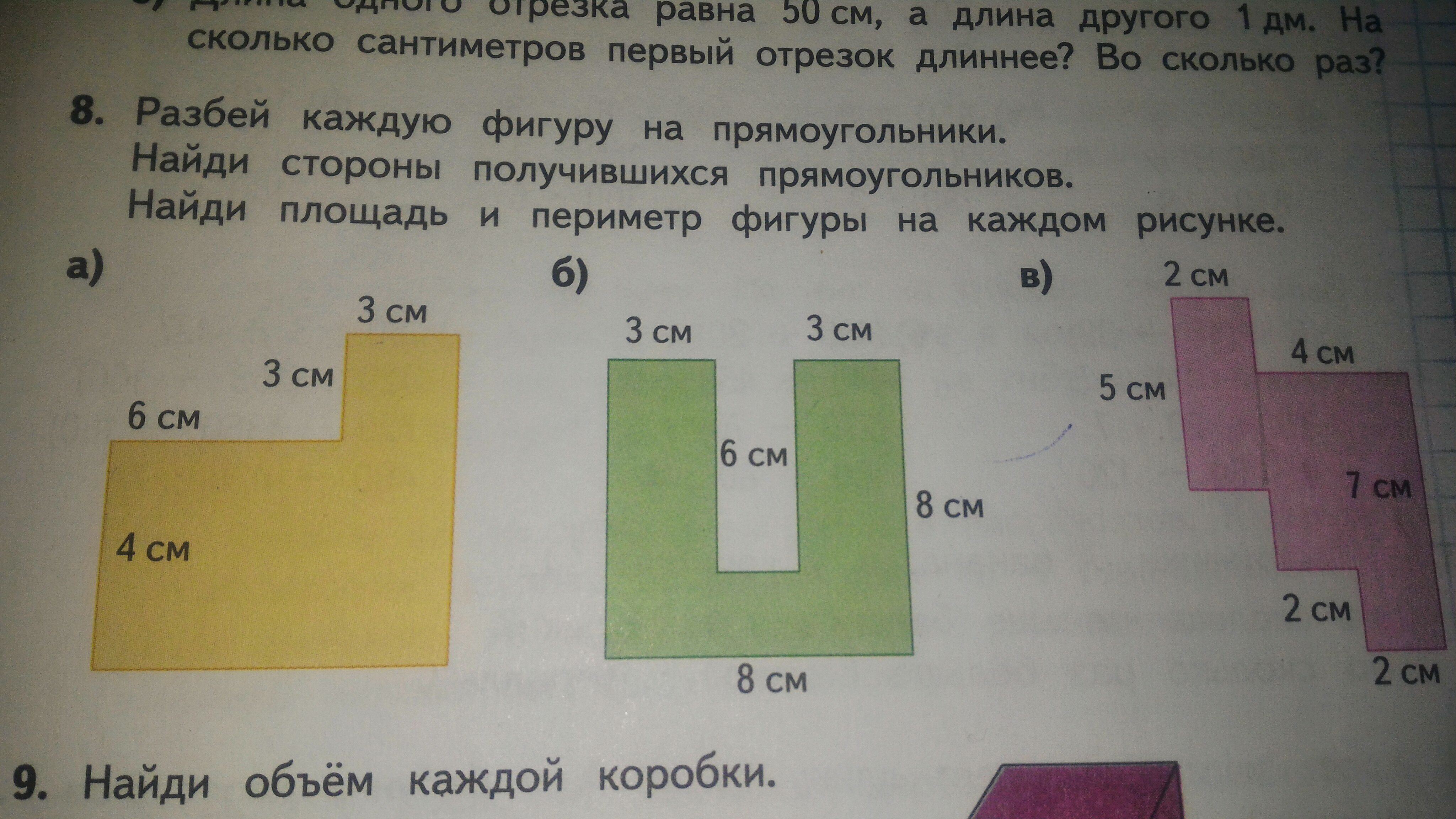 а) Отдели прямой линией верхний кусочек от нижнего, получится сверху квадрат со стороной 3 см, а внизу прямоугольник длиной: 6 + 3 = 9см и