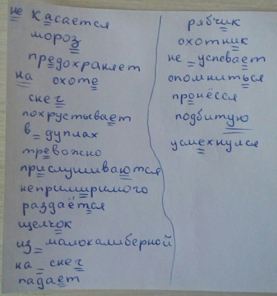 Вдруг раздаёт...ся щелч...к выстрела (из) малокалиберной винтовки и (на) сне... пада...т рябч...к. Охотн...к (не) успева...т опомнит...ся как за полсекунды пр...нёсся соболь схватил подбит... птицу и был таков. Вот разбойник усм...хнулся охотник.