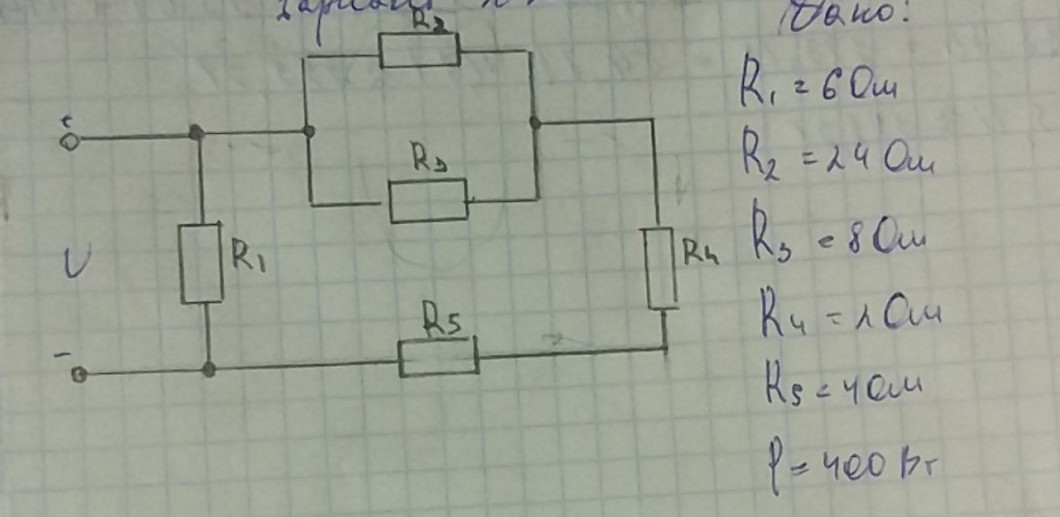 =10А. Теперь мы можем заметить следующее: ток разветвляется на 2 ветви , то есть на R1 и на ветвь с резисторами R2-R5. Если мы посчитаем сопротивление на ветви с сопротивлениями R2-R5: (1/1/R2+1/R3)+R4+R5=120 Ом , то заметим , что это сопротивление в 20 раз больше сопротивления R1 . А общий ток разделяется на 2 ветви и по закону сохранения заряда равен сумме токов входящих в узел. То есть По ветви с сопротивлением R1 пойдёт ток в 20 раз больший , чем по ветви с сопротивлениями R2-R5. Значит мы можем найти ток на ветви с сопротивлениями R2-R5 так: I=I1+20I1 , I=21I1 , отсюда I1=I/21=10/21=0.47 А. То есть на резисторах R4 , R5 будет идти ток равный 0.47 А , А на резисторе R1 в 20 раз больший , то есть 20*0.47=9.52 А. Теперь Заметим следующее: Сопротивление резистора R2 в 3 раза больше , чем на резисторе R3 , следовательно по нему пойдёт ток в 3 раза меньший. По закону сохранения заряда ток I1 разделится на 2 тока 1 из которых будет в 3 раза больше другого. I1=I2+3I2 , I1=4I2 , отсюда находим ток I2. I2=I1/4=0.11 А. Этот ток будет идти , где резистор R2 , а на резисторе R3 будет идти ток в 3 раза больший , то есть 0.11*3=0.33 А.