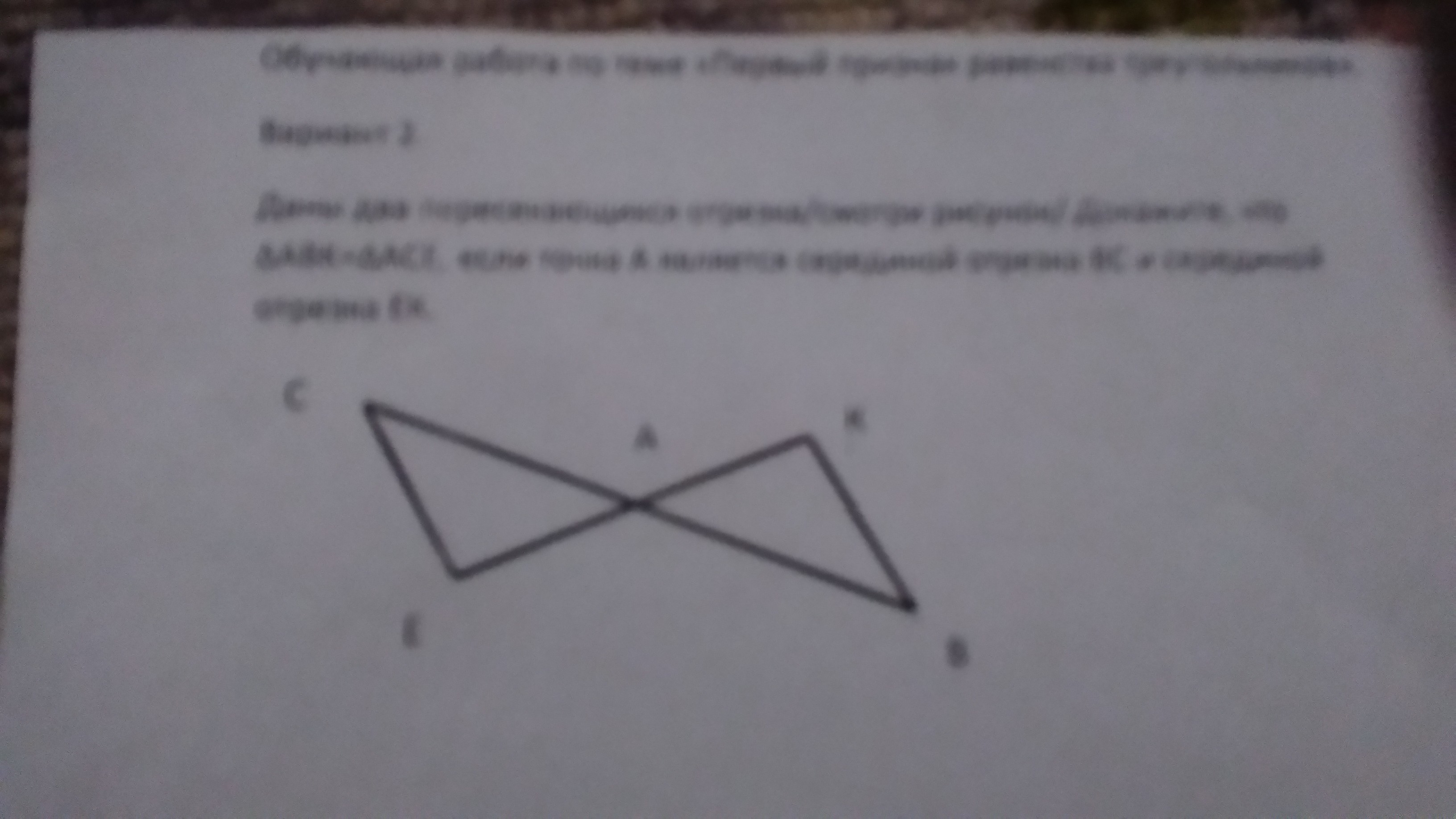 даны два пересекающихся отрезка смотри рисунок докажите что угол ABC равняется углу AСЕ если точка А является серединой отрезка AС и серединой отрезка ЕК