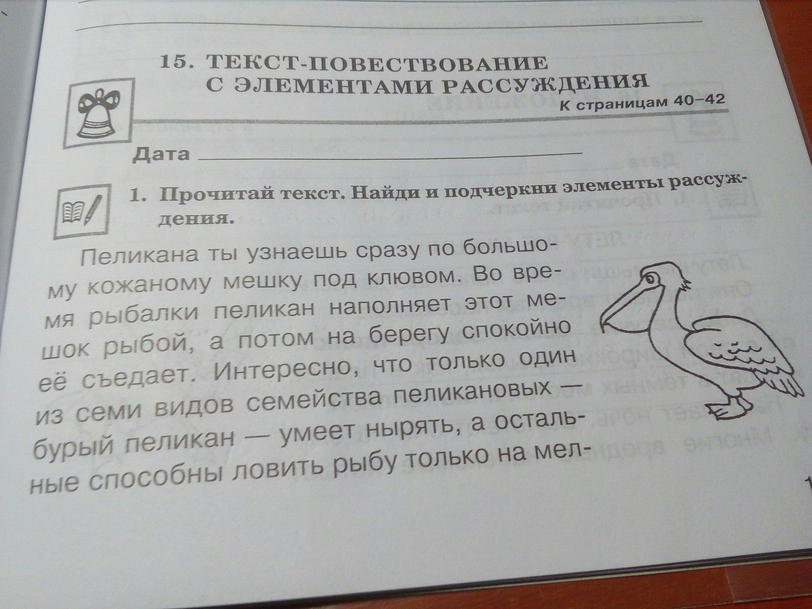 элементы рассуждения: Пеликана ты узнаешь по большому кожаному мешку под клювом. во время рыбалки пеликан наполняет этот мешок рыбой, а потом на берегу спокойно её съедает. дело в том, что массивное туловище этих птиц имеет небольшой удельный вес: их тело пронизано сетью воздушных мешков, а кости полые и очень лёгкие