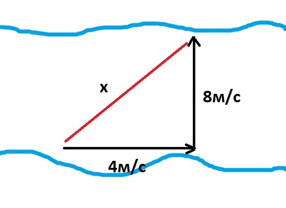 Моторная лодка, имеющая собственную скорость 8 м/с, должна переправиться через реку по кратчайшему пути. Определите, под каким углом к берегу следует направить лодку, если скорость течения реки 4 м/с?