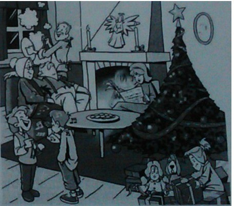 It is Christmas Day. Mrs Huston is reading a newspaper. Mr Huston 1) is doing the washing-up. The boys 2)are singing Christmas carols. Grandmother and grandfather 3) are sitting on the sofa. Grandmother 4) is listening to the boys singing but grandfather 5) is sleeping. The girls 6) are opening their presents. The dog 7) is looking at the girls. It is very cold. It 8) is snowing outside and so the Hustons 9) are staying at home tonight.
