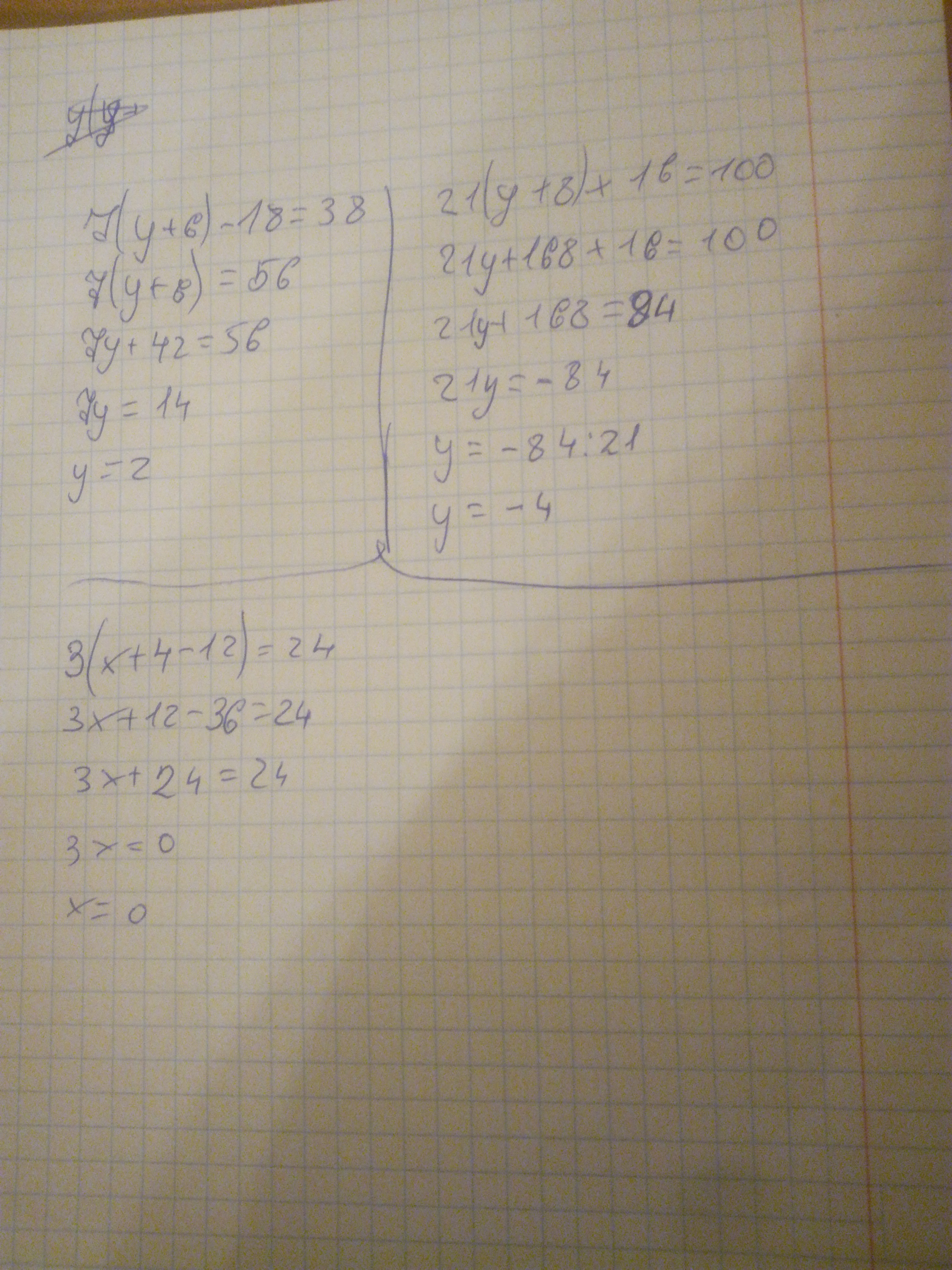 Помогите 7 (+ у + 6 )минус 18 равно 38. 21( у минус 8) плюс 16 равно 100. 3(икс плюс 4 минус 12 )равно 24. Скиньте фотку где ответили на листочке