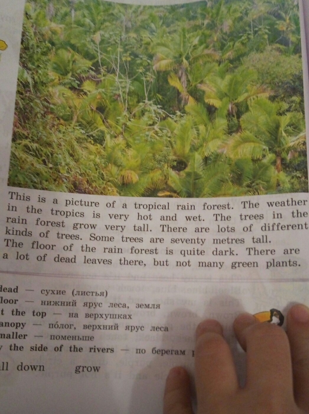 На этой картинке изображен тропический дождливый лес. Погода в тропиках очень жаркая и влажная. Деревья в дождливой лесу очень высокие. Там есть много разных видов деревьев. Некоторые деревья 70 метров в высоту.