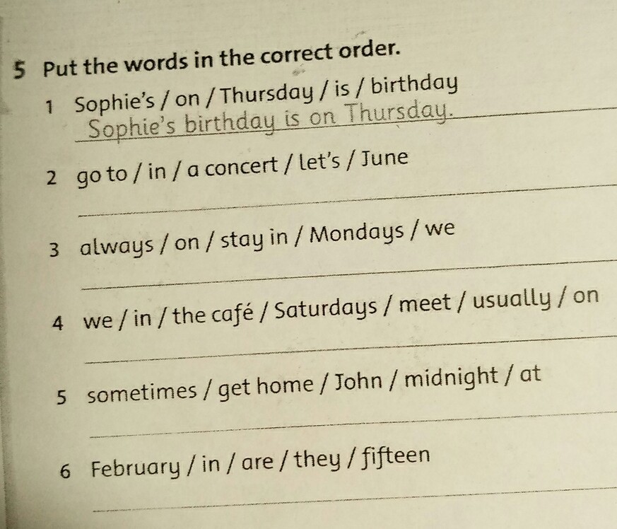 Let s go to a concert in June. We always stay in on mondays. On satudays we.usually meet in the cafe. Sometimes John gets home at midnight. In February they are fifteen