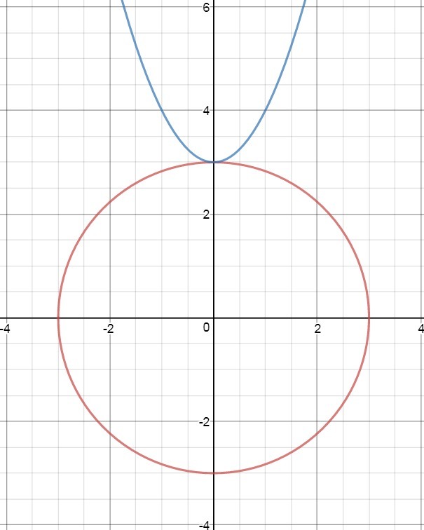 одно решение будет только если вершина будет лежать на верхней точке окружности, т.е. в точке (0;3) ⇒ m=3