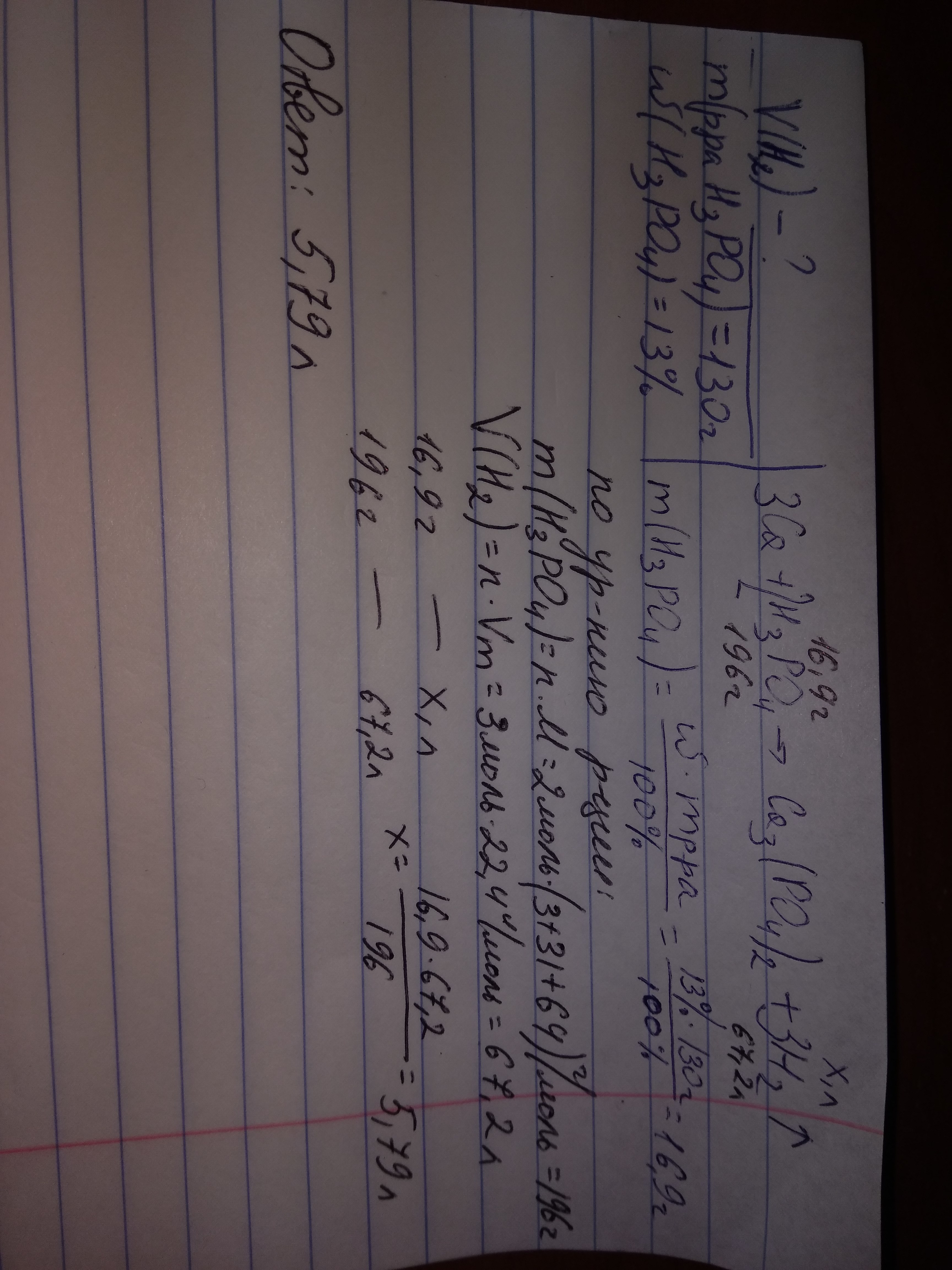 какой объем водорода выделится при взаимодействии 130 грамм 13% раствора фосфорной кислоты с кальцием