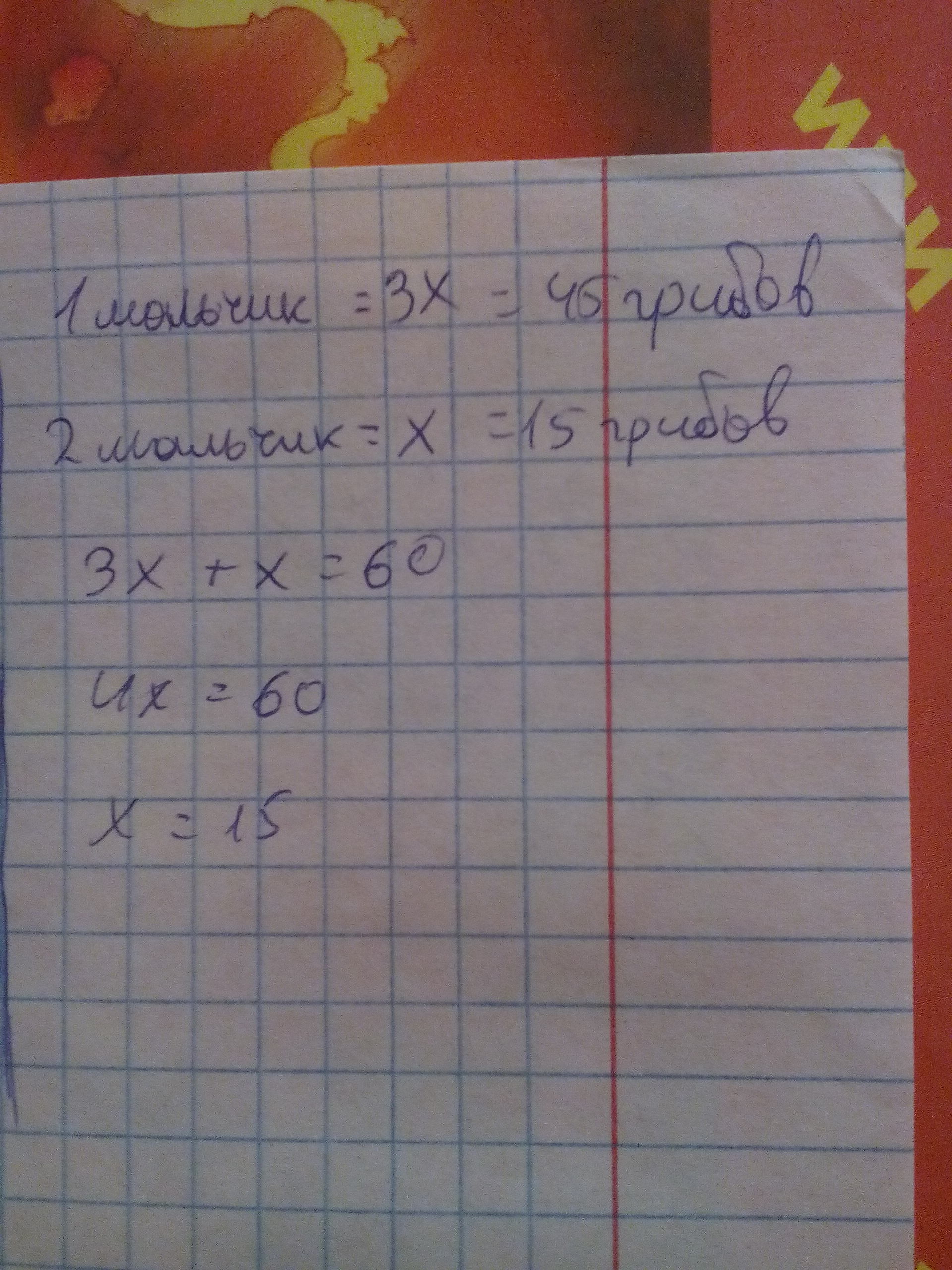 Два мальчика пошли в лес за грибами первый собрал в 3 раза больше чем второй другой всего 60 грибов Сколько собрал каждый из них?