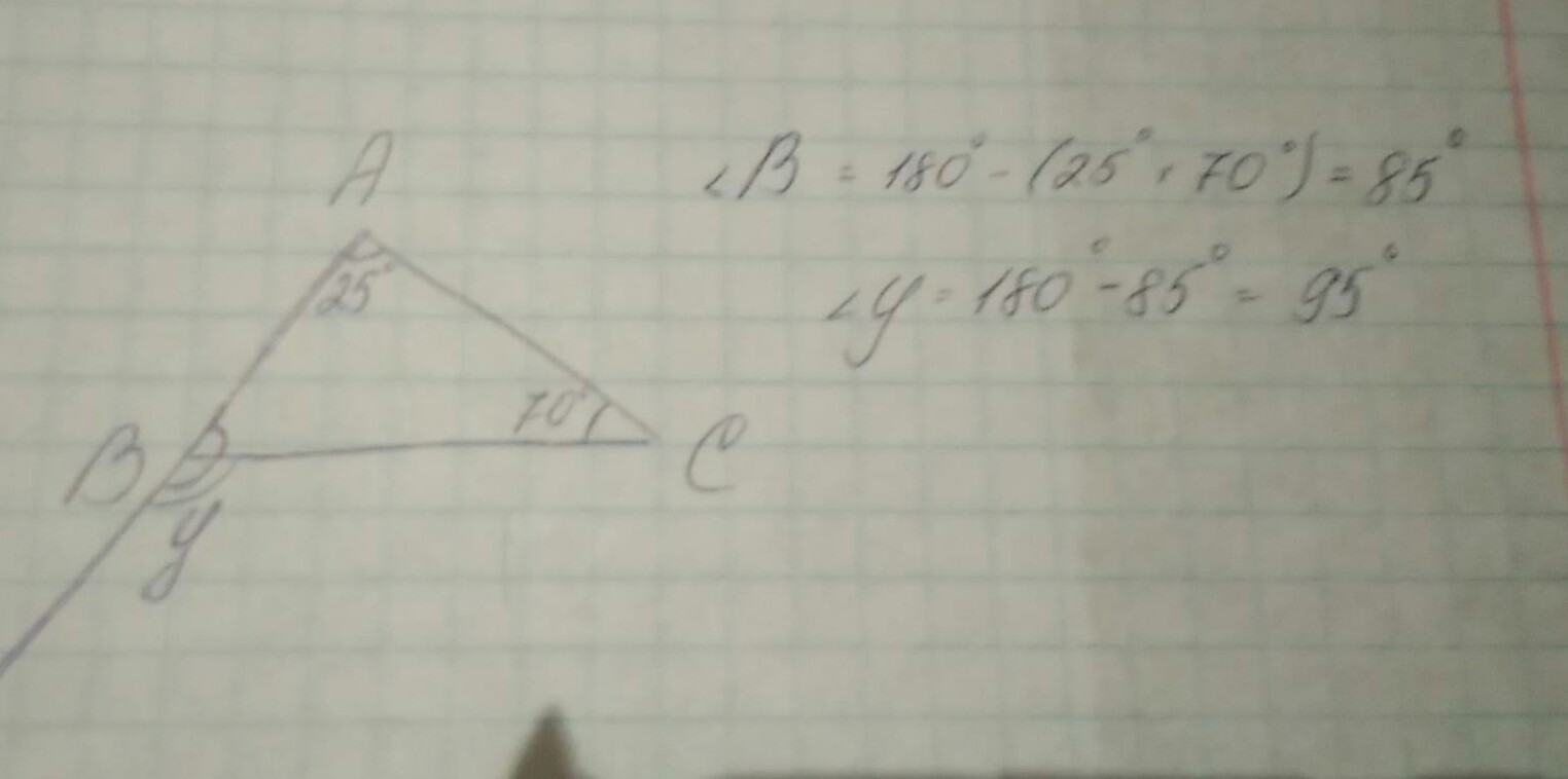 В треугольнике ABC угол A равен 25 градусов, угол C равен 70 градусов. Найдите угол, смежный с углом B