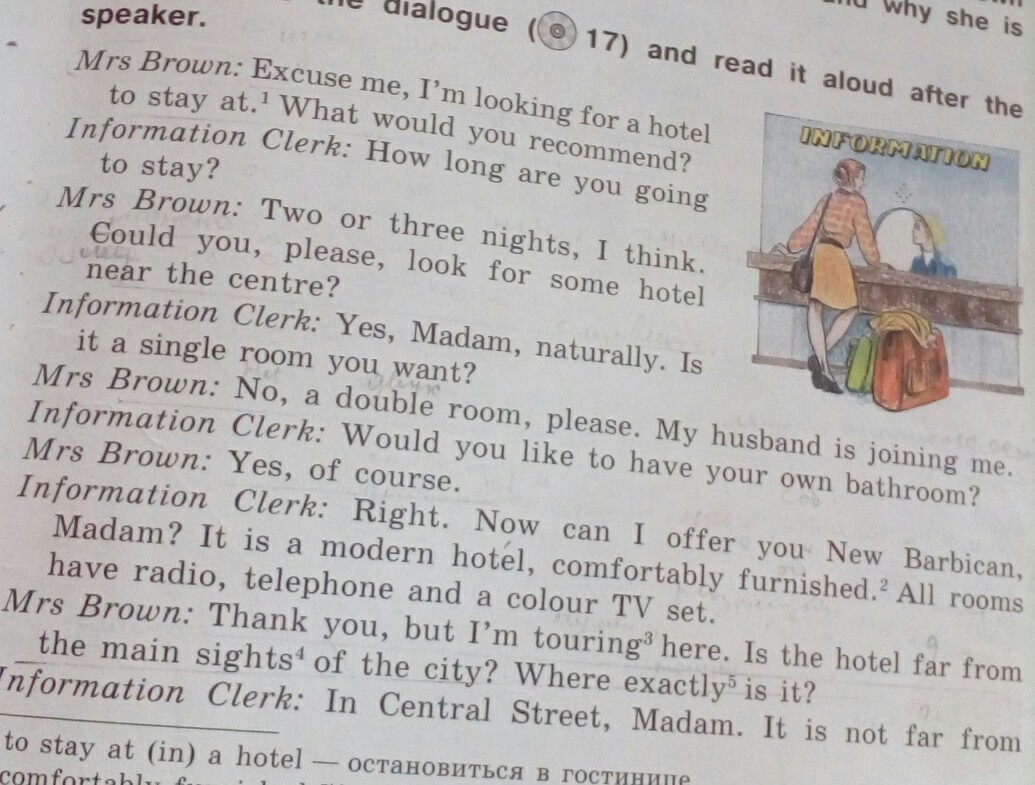 Миссис Браун: Две или три ночи, я думаю. Не могли бы вы пожалуйста поискать отели поближе к центру?