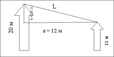 По теореме Пифагора найдём расстояние L между их верхушками.