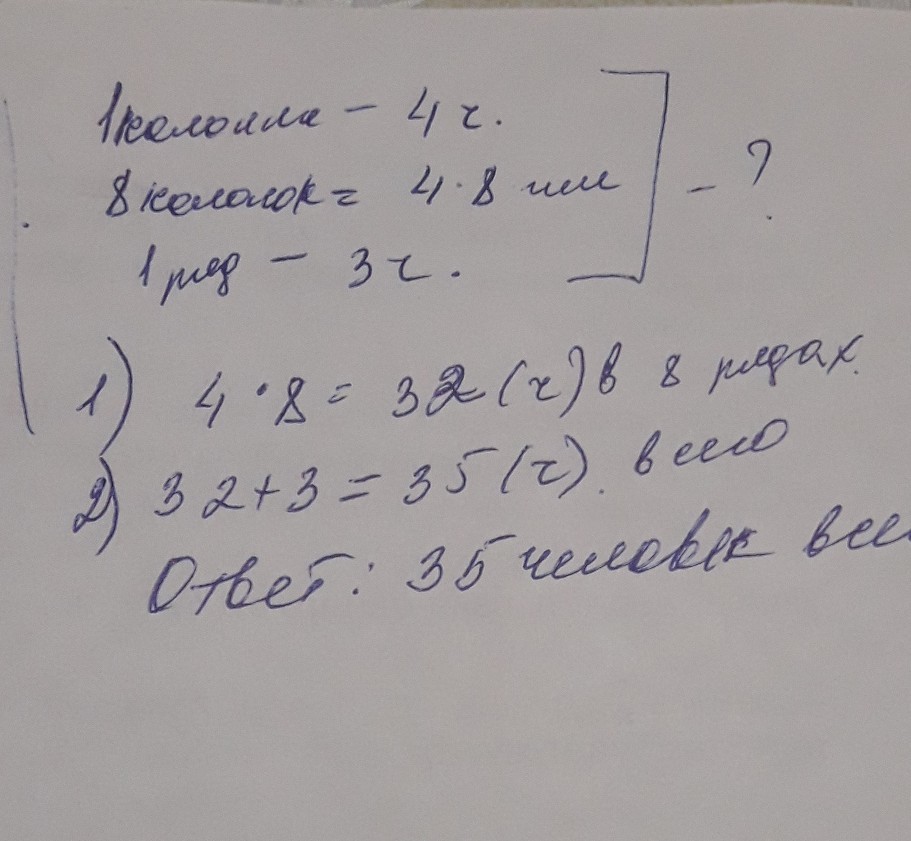 8*4+3=35(человек) мы умножаем кол-во человек на кол-во рядов и прибавляем оставшихся людей