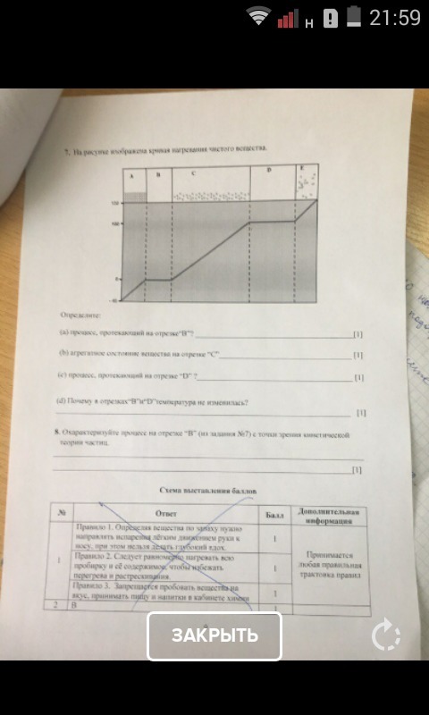 8.Мы видим,что на отрезке B,происходит переход из жидкого в твёрдое состояние(плавление).Кинетическая теория частиц,иначе Молекулярно-кинетическая теория,объясняет,что при твёрдом агрегатном состоянии,молекулы соединены прочно и совершают небольшие колебательные движения,таким образом сохраняя форму.В жидком состоянии,молекулы подвижны/хаотичны(пределы вещества),и они не сохраняют форму,если их,конечно,не перелить в сосуд.И таким образом,при повышении температуры вещества(твёрдого),молекулы начинают двигаться быстрее и быстрее,так же увеличивается расстояние между молекулами,что влияет на объём(тело становится шире)(подогрев),при подогреве молекулы становятся подвижнее,и из-за этого становятся хаотичными в пределах вещества,как и в жидком состоянии .Именно в эту фазу,температура не изменяется,как было сказано, поступающая энергия уходит на разрушение кристаллической решётки,и из твёрдого агрегатного состояния переходит в жидкое.Пример:плавление железа.