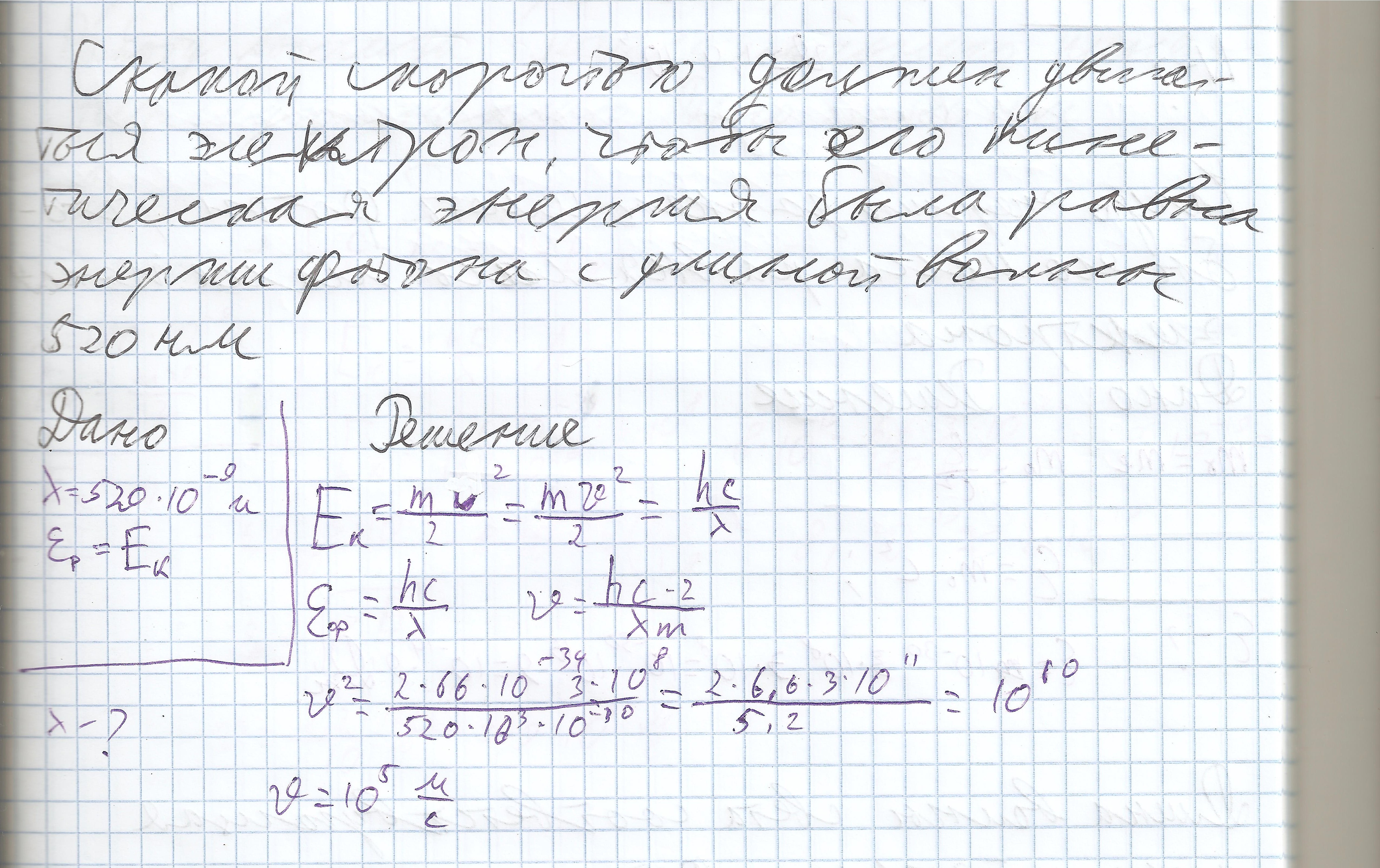 С какой скоростью должен двигаться электрон, чтобы его кинетическая энергия была равна энергии фотона с длинной волны 520 нм.