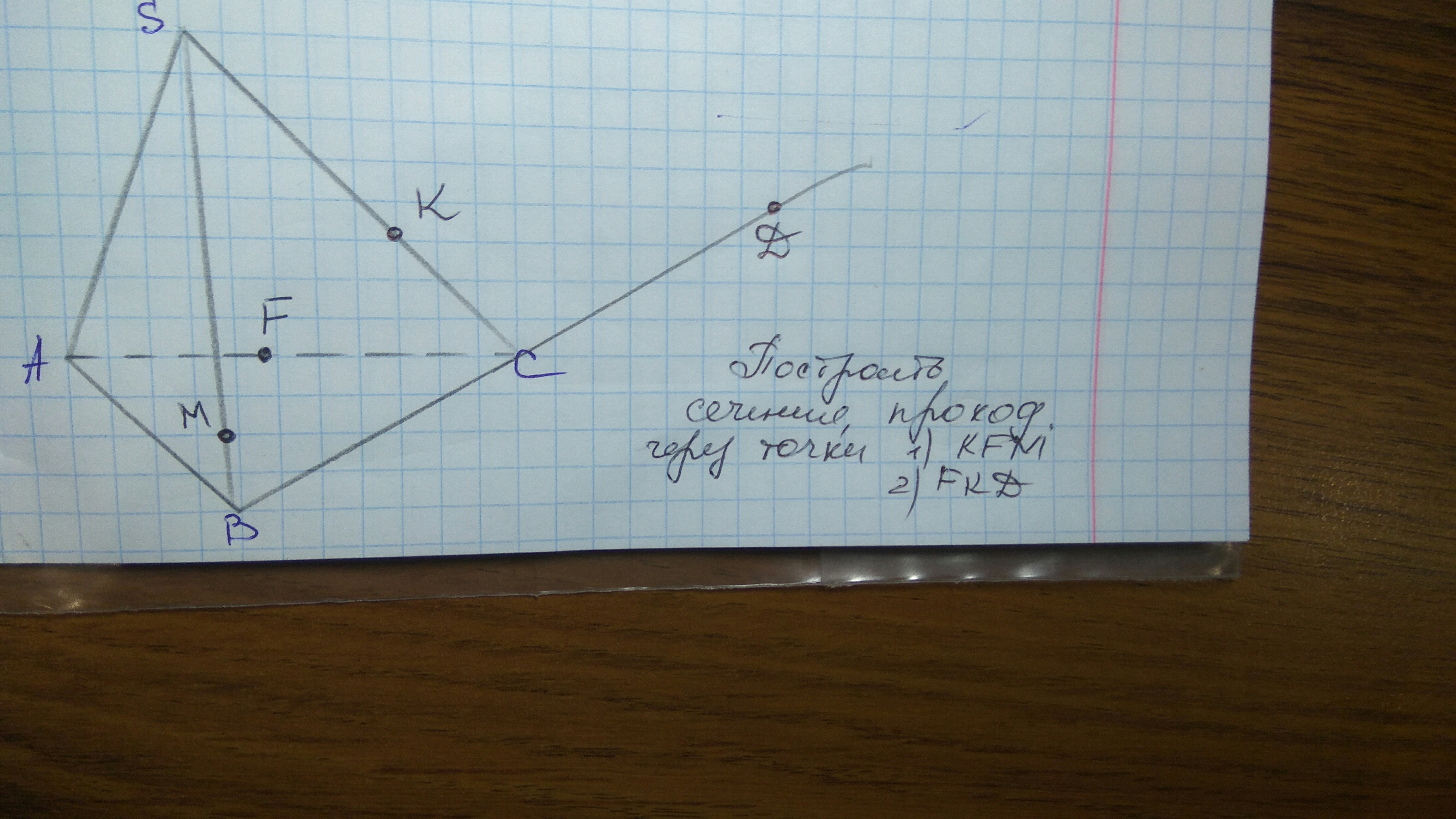 F соединяем с K, M соединяем с K (т.к. точки лежат в одних и тех же плоскостях), через точку F проводим прямую, параллельную KM, она будет лежать в пл-ти сечения, т.к. параллельна MK и проходит через точку сечения. Далее просто все соединяем и получаем сечение