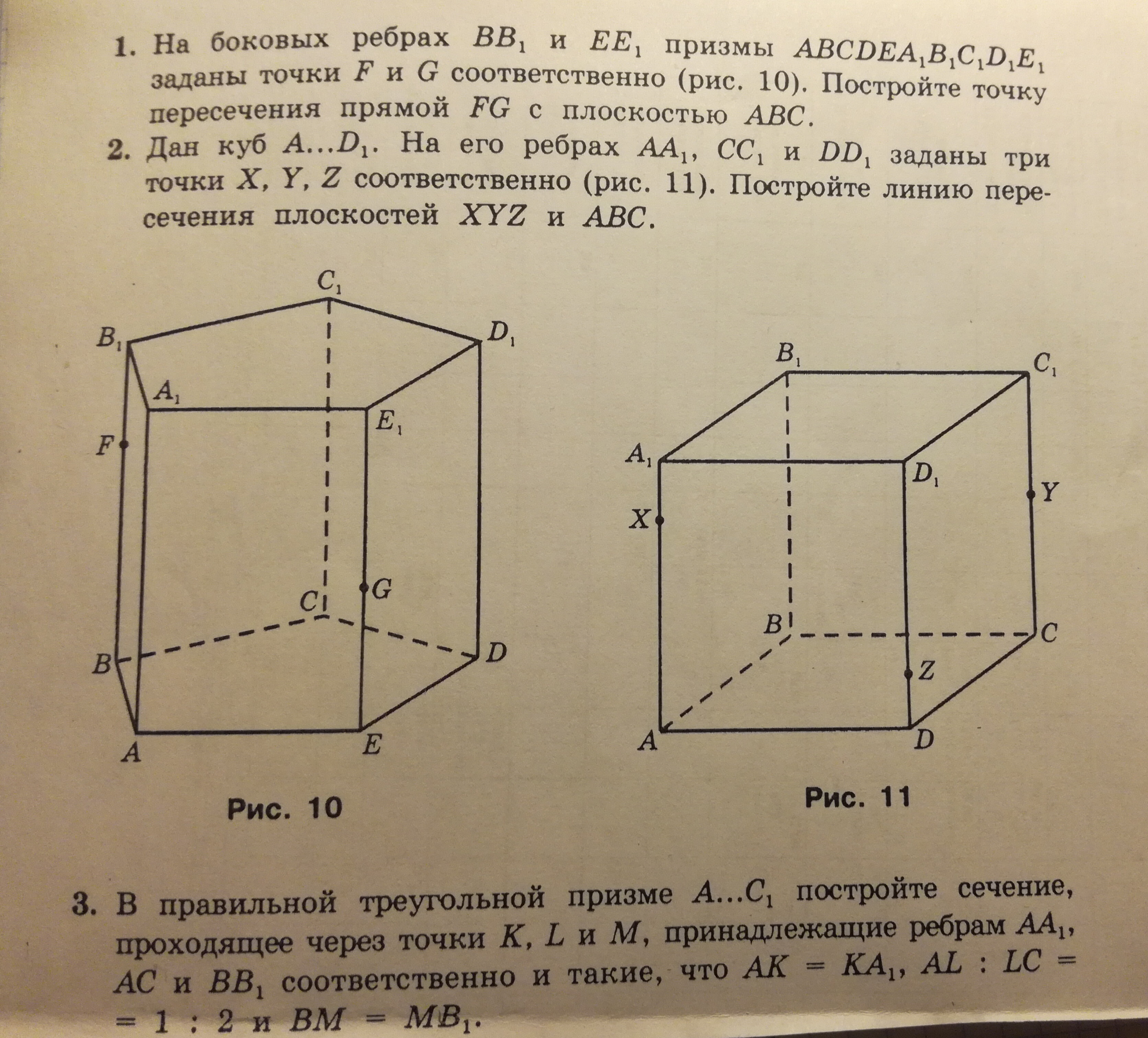На боковых ребрах BB1 и EE1 призмы ABCDEA1B1C1D1E1 заданы точки F и G соответственно(рис. 10) Постройте линиюпересечения плоскостей XYZ и ABC